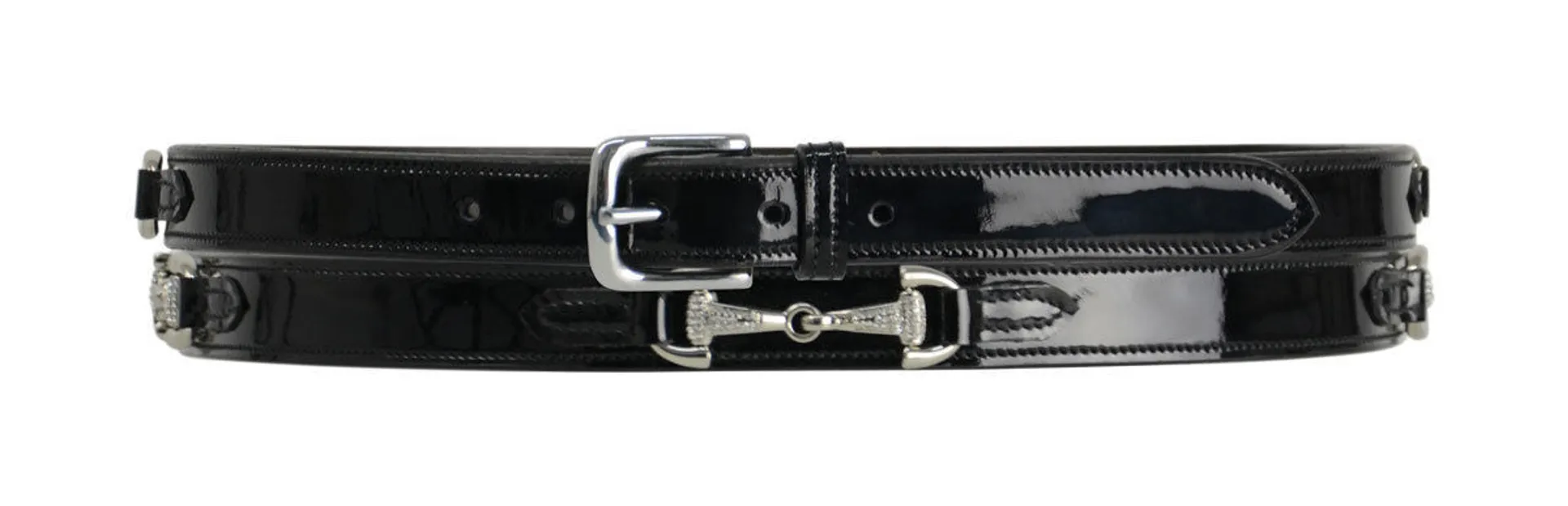 The Hy Crystal Snaffle Bit Belt features a patent leather belt with three crystal snaffle bits to add a hint of bling to a smart look.