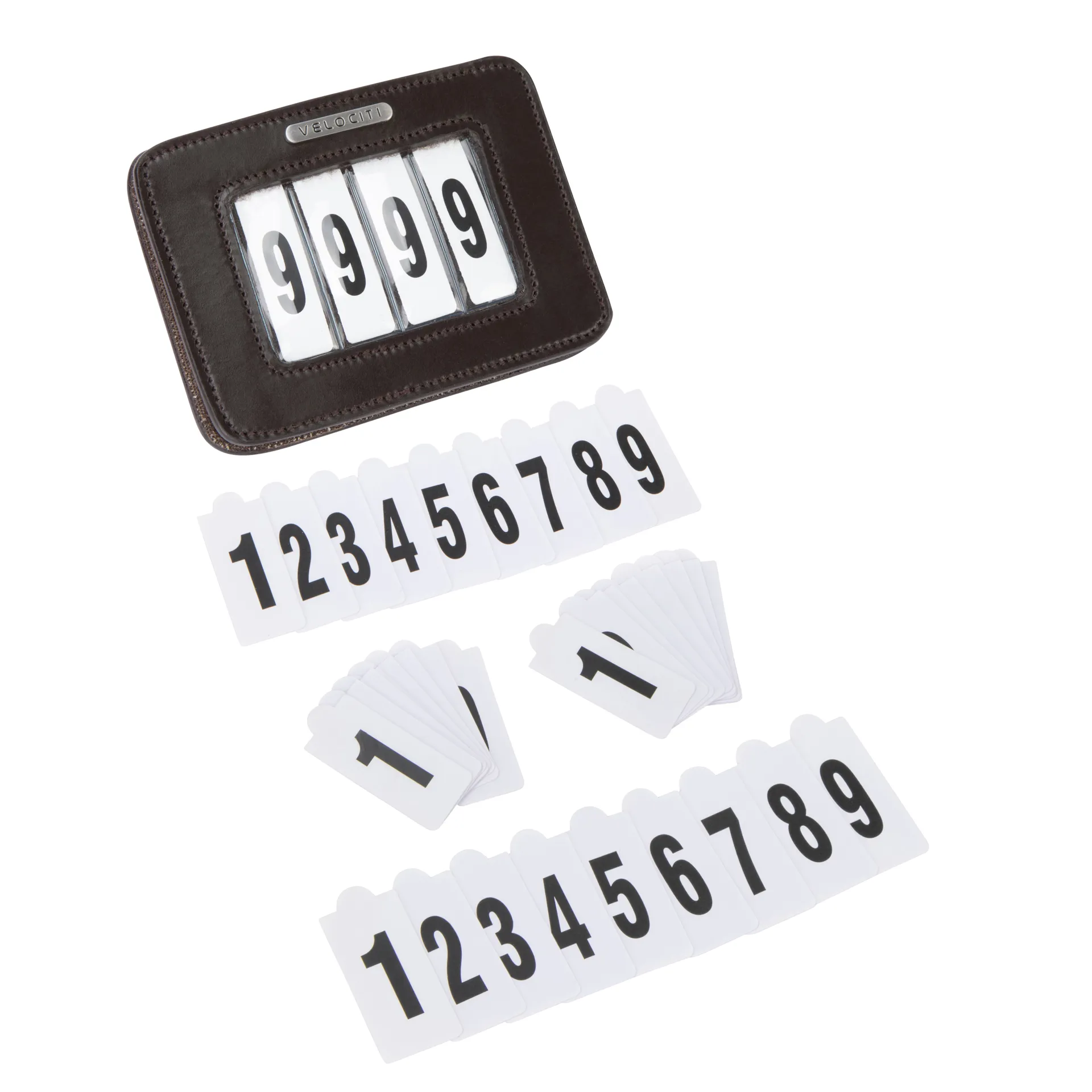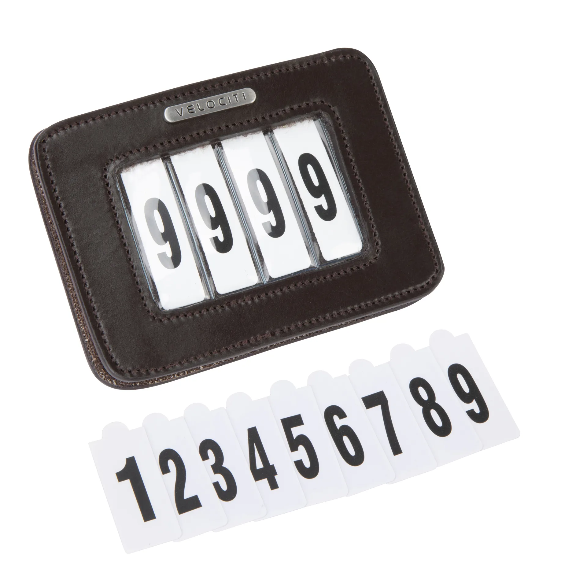 The leather unit is supplied with a wipe clean 3-slot sleeve and 3 sets of numbers 0-9.