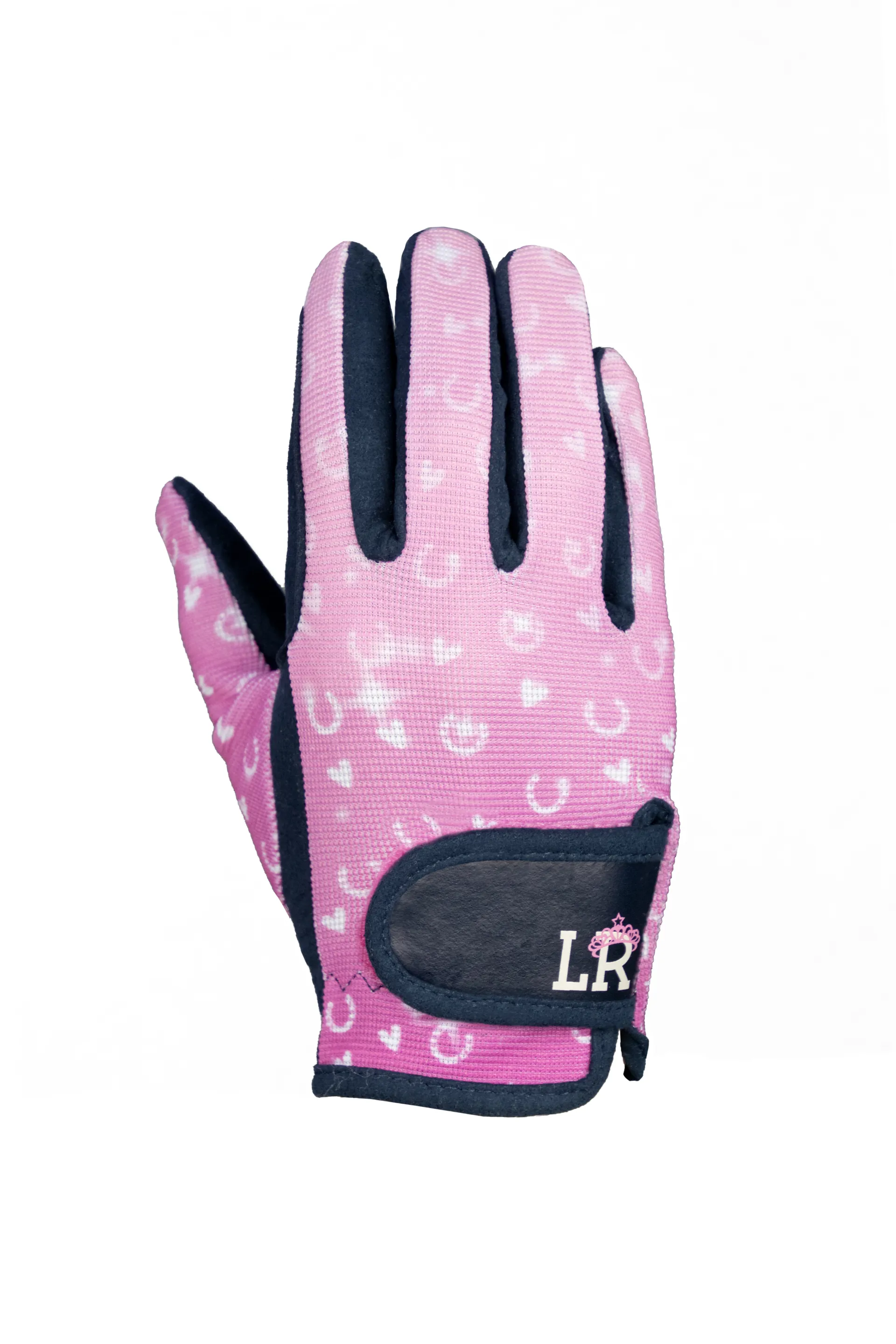 These pull on gloves feature pony fantasy pink ombre patterned back and navy amara palm to assist with grip when holding the reins.