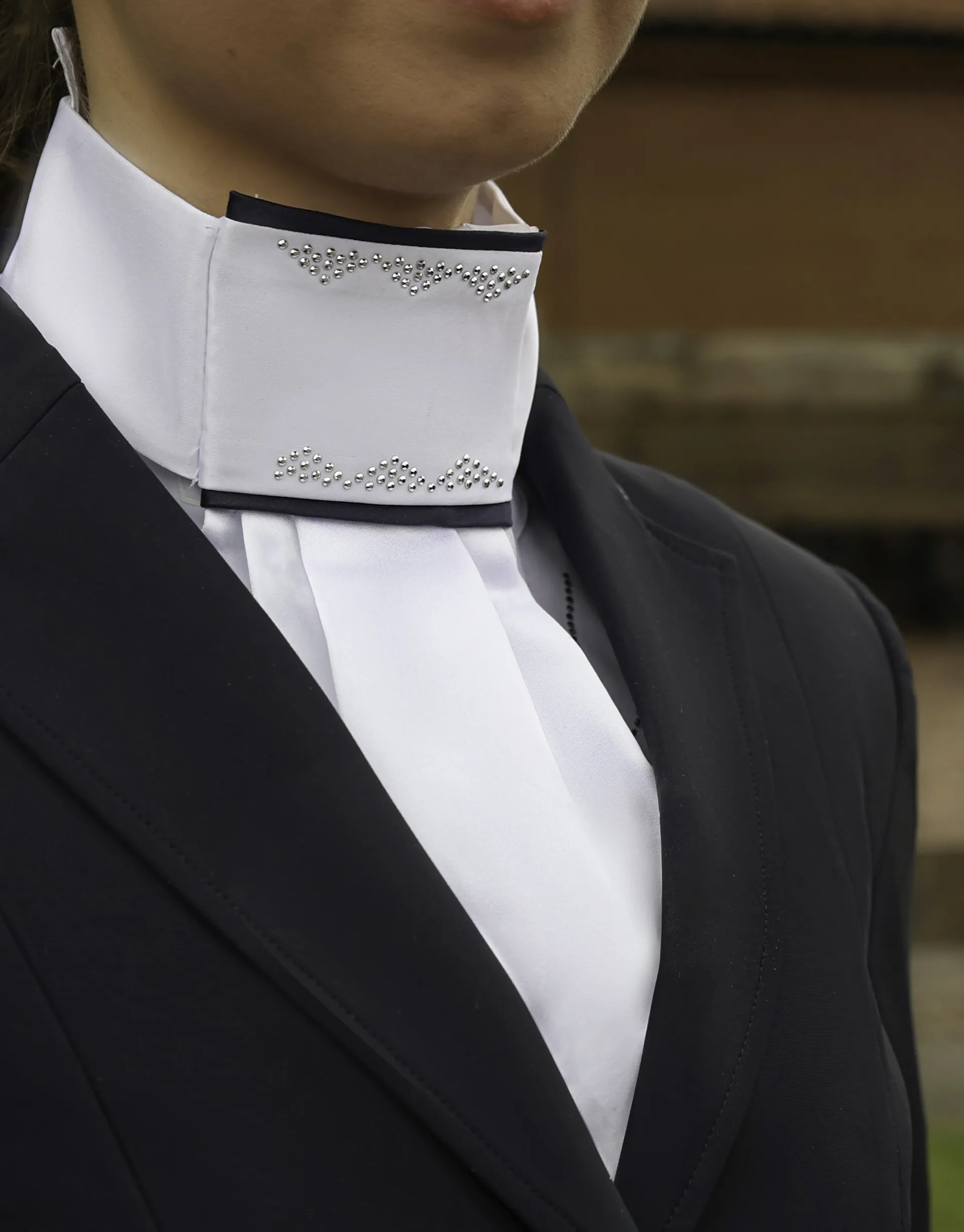 Made in England and designed with elegant silver diamantes, finished with sophisticated navy suede edging. Optimal fit is ensured through the adjustable velcro fastening and the luxuriously soft satin textile gives a comfortable yet stylish look. Completed with iconic silicone coldstream branded to the base of the bib. Designed to complement the Addinston show jacket, Lanark show shirt and Eckford crystal breeches.