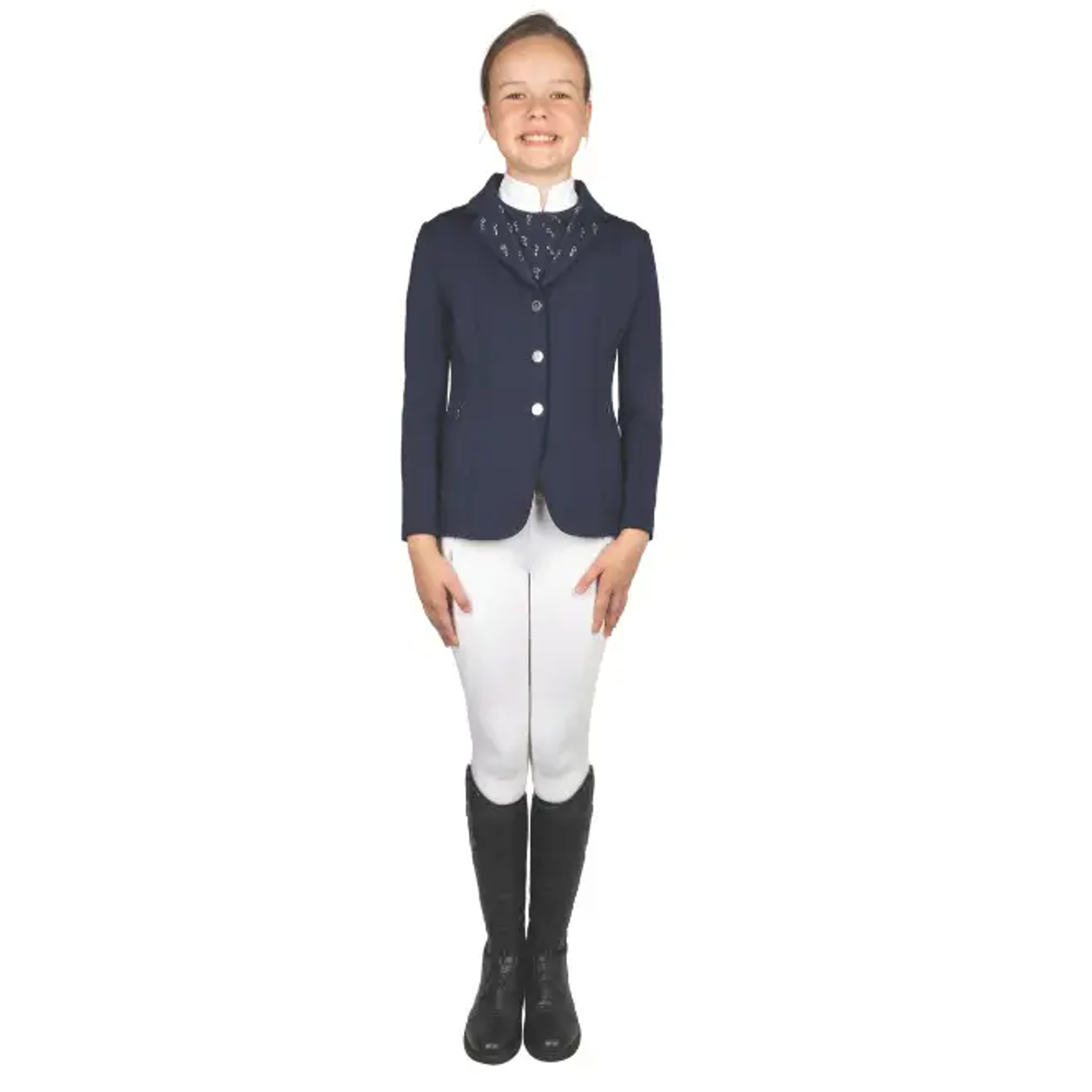 Combining classic elegance with modern performance, this beautifully tailored jacket flatters the rider’s silhouette while allowing full freedom of movement thanks to its high-performance stretch fabric. A breathable, moisture-wicking lining keeps riders cool and comfortable, while subtle diamante detailing adds a touch of sparkle for a polished competition look.