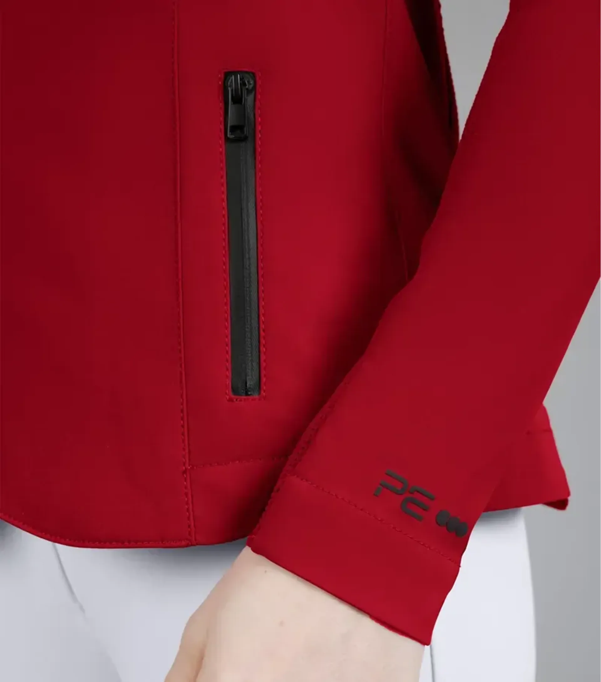 Classically cut, this competition jacket is formed to provide a flattering silhouette, with meticulously placed style lines. A traditional notched lapel collar sits at the top of a ykk zip, concealed by a clean, press stud closure. Two pockets offer a place for storing your valuables, with added security provided by zip closures of a matte finish. The subtle matte styling continues across the finer details of this jacket, included the branded press stud closures, and pe branding at the periphery of the cuff. An embossed PE form is elegantly rested on the riders right arm, boasting the quality and functionality of this luxury performance jacket.