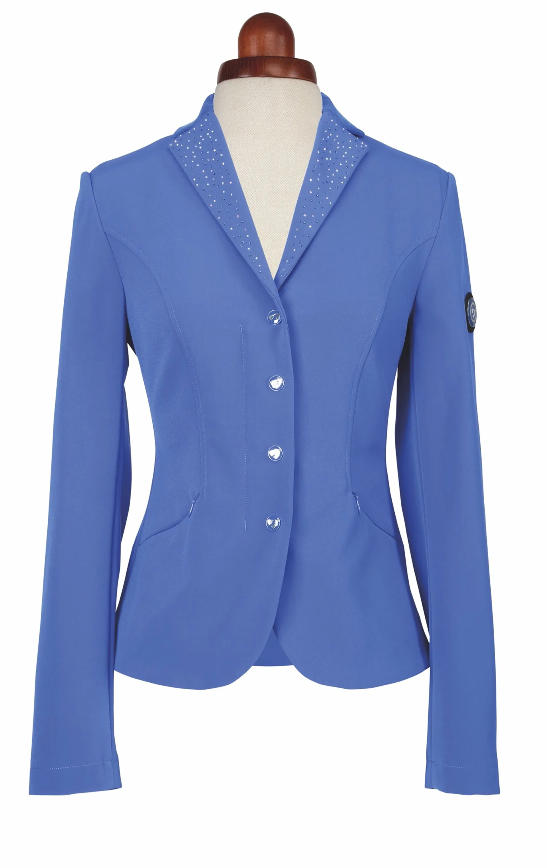 Sparkle in the show ring with the sleek Shires Aubrion Park Royal Riding Jacket which features diamante detailing, sport fit, and is tailored for a shorter length fit and a suede collar trim with iridescent diamante.
