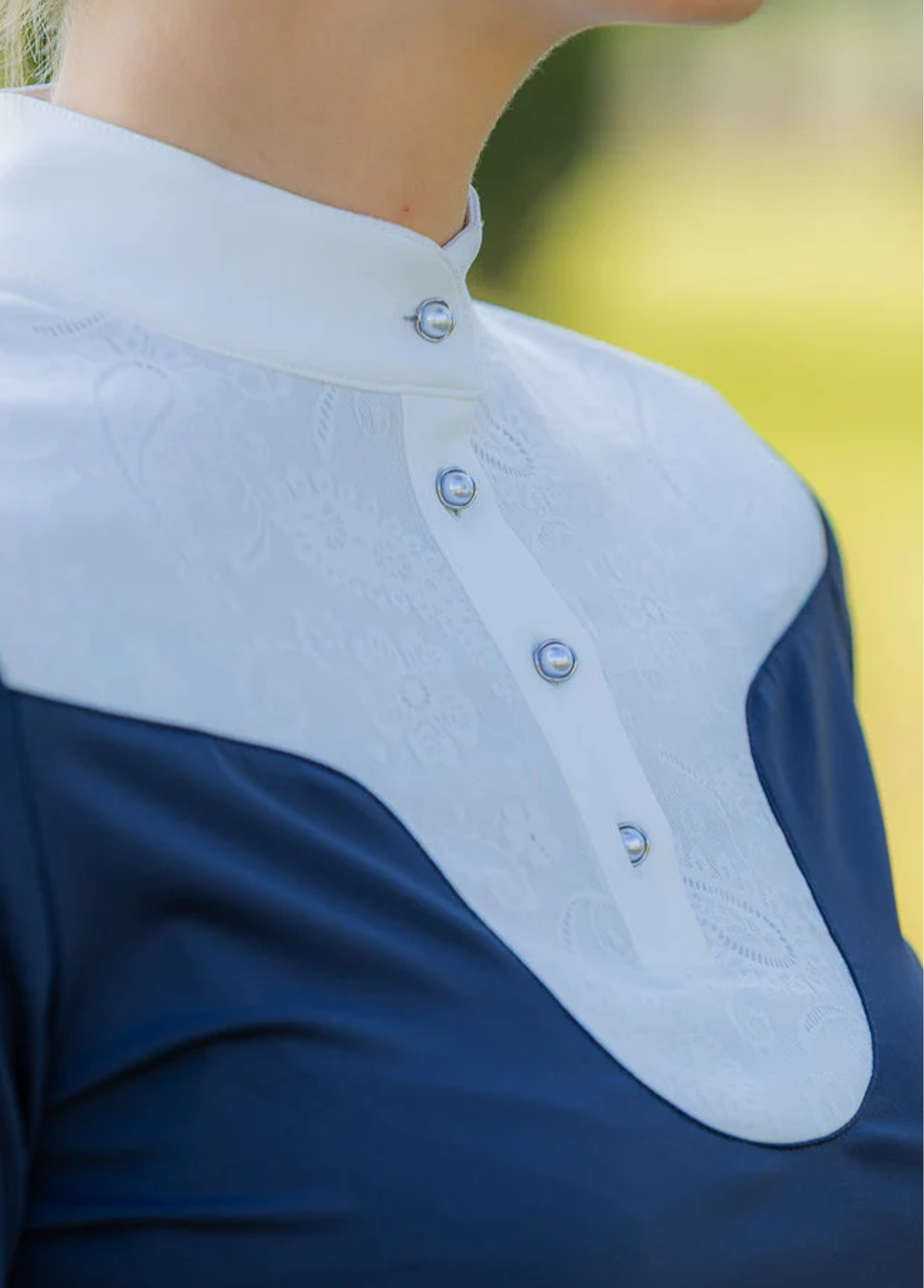 Crafted from exclusive iFlex Pro fabric, this premium material is slightly heavier than traditional base layers, delivering a more structured, flattering silhouette while remaining highly breathable with excellent moisture-wicking properties to keep you cool under pressure. Engineered with 4-way stretch, the shirt moves effortlessly with the rider, whether walking the course or riding between classes. Refined details such as faux pearl buttons and a delicate lace overlay complete the polished competition look.