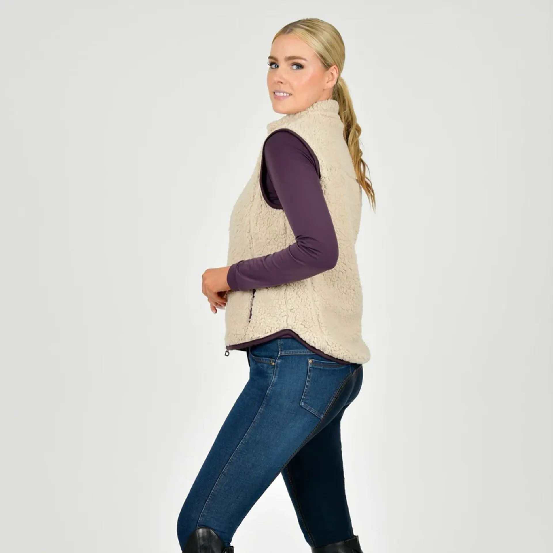 Question(s) answered about Dublin Ladies Thea Teddy Vest - Natural/Plum Perfect Trim