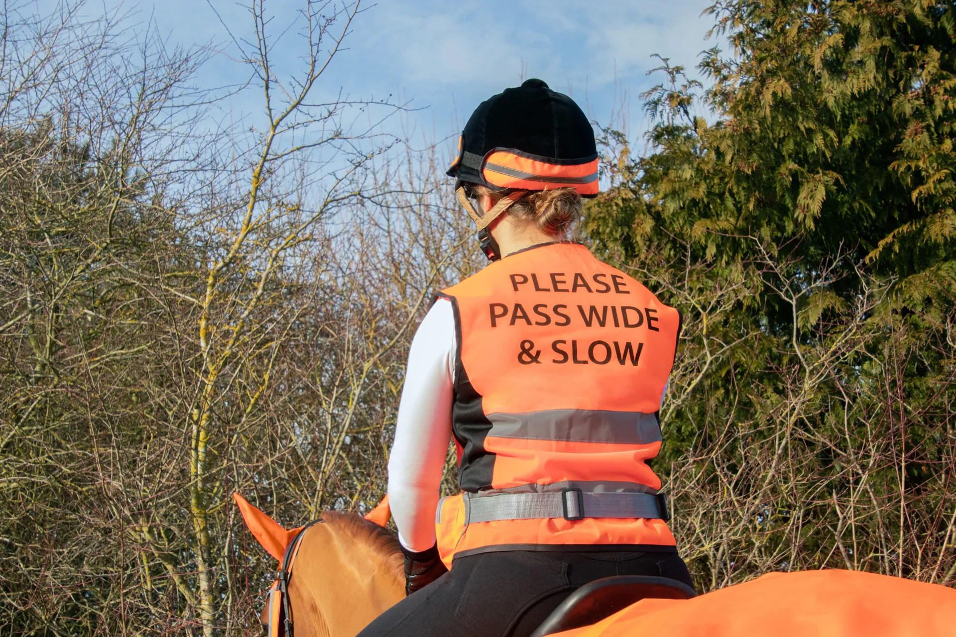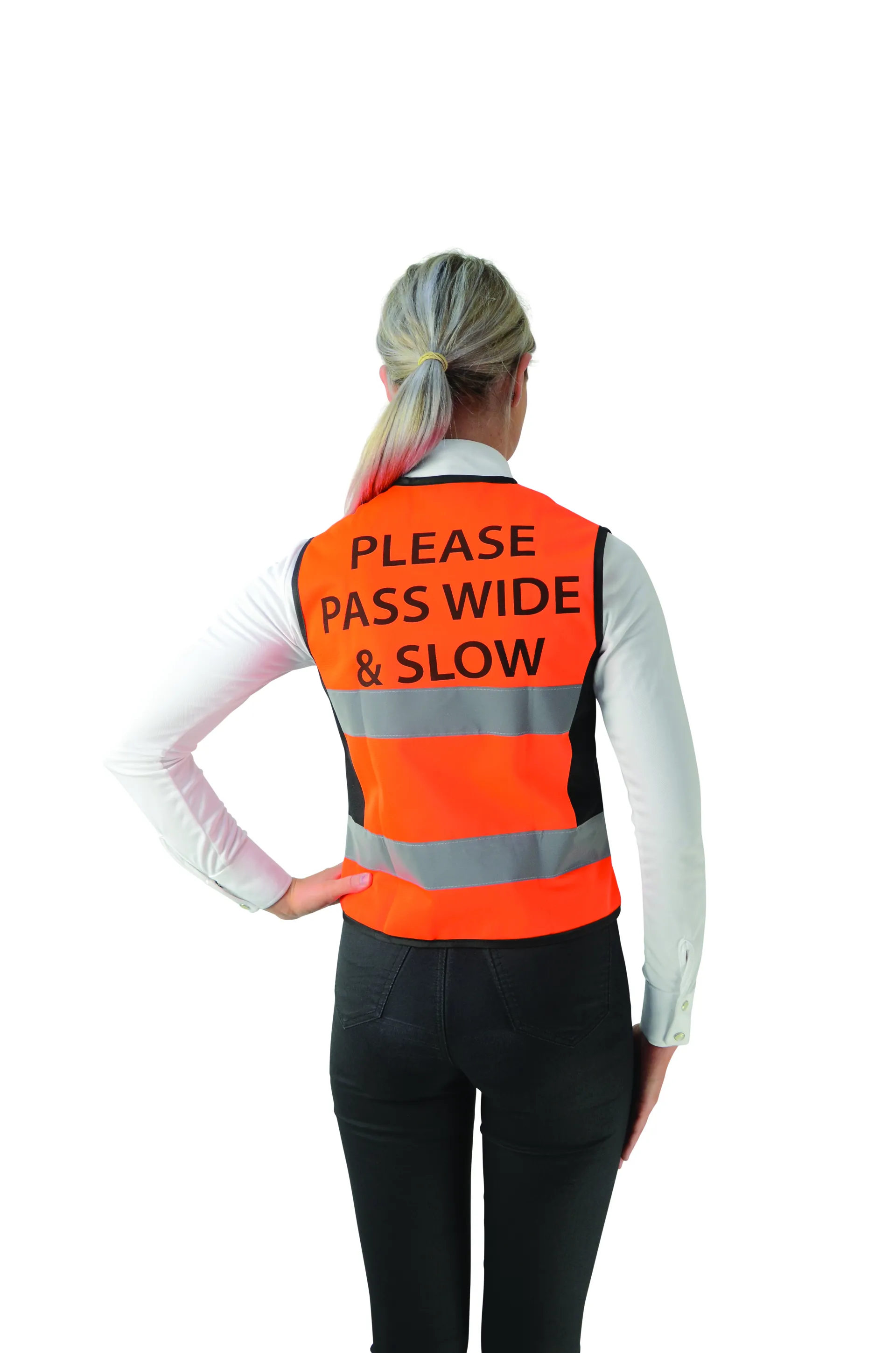 Stylish HyViz waistcoat with "Please Pass Wide & Slow" printed on the back.