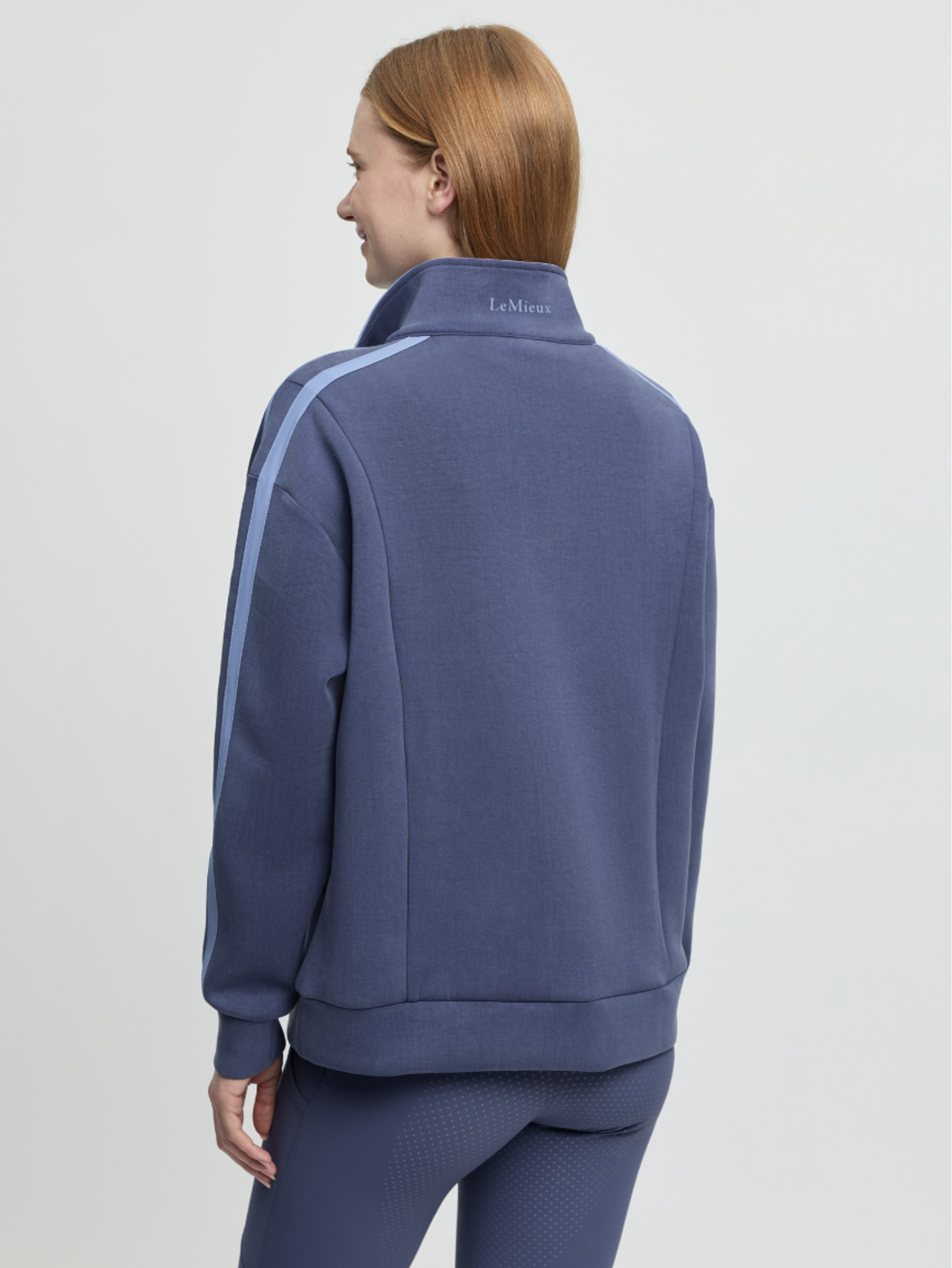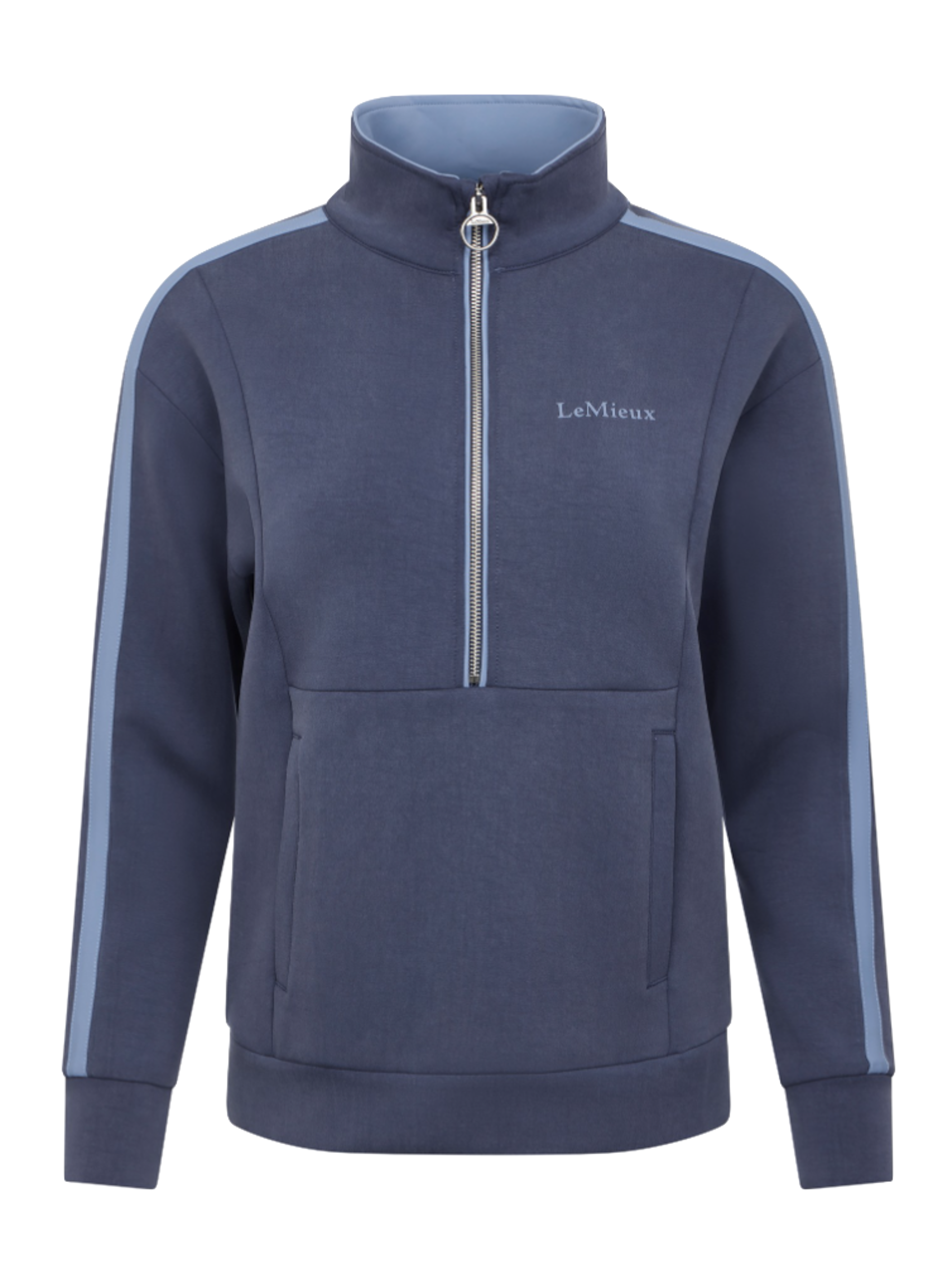 Cool touch, sporty fabric prevents you overheating, while the soft and smooth inside caresses your skin. The quarter neck has a statement LeMieux branded zip with contrast piping. Plus, an athletic style front pocket with inner mesh phone pocket adds convenience. Colour pops inside the collar and double stripes down the arms lift the piece from workout to wow.