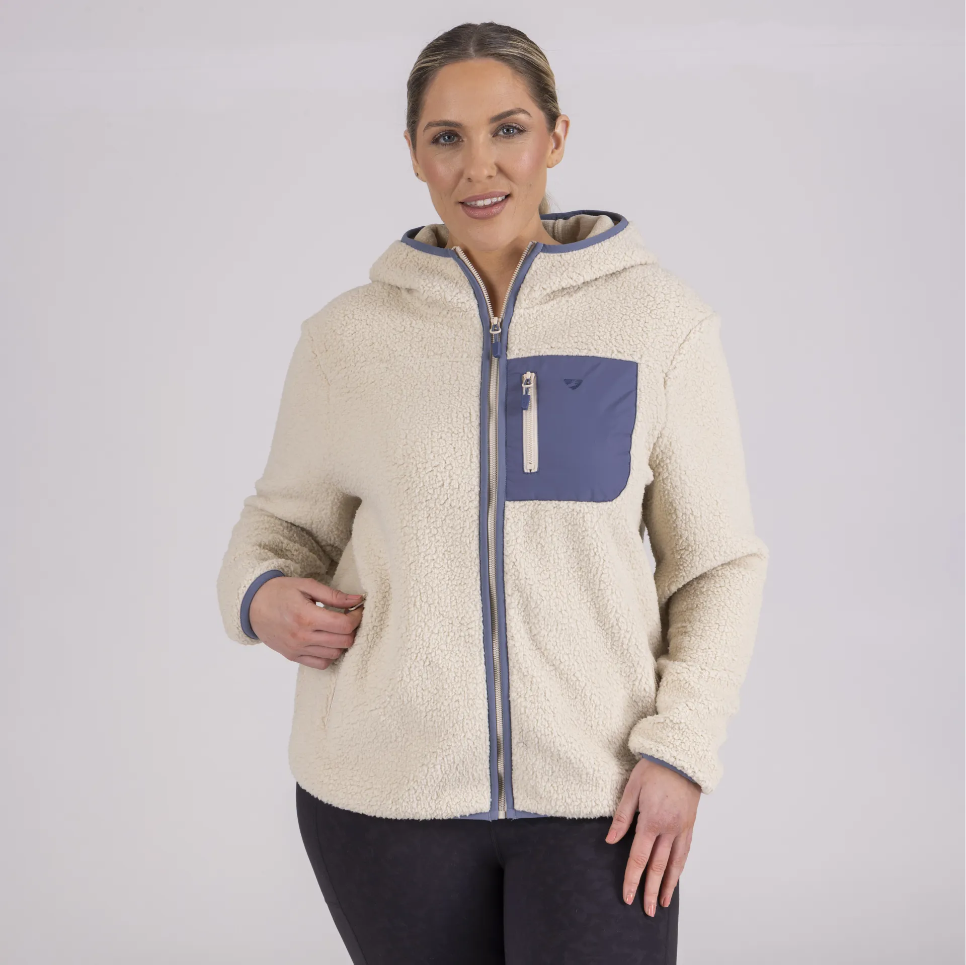 Designed in on-trend sherpa fleece for cosiness. The jacket features a patch zip pocket at the chest for a retro look. The velvety feel inner gives extra snugness as do the two zip hand warmer pockets with soft feel lining. The shape is relaxed with a generous hood and is ideal worn over a base layer and under a roomy jacket.