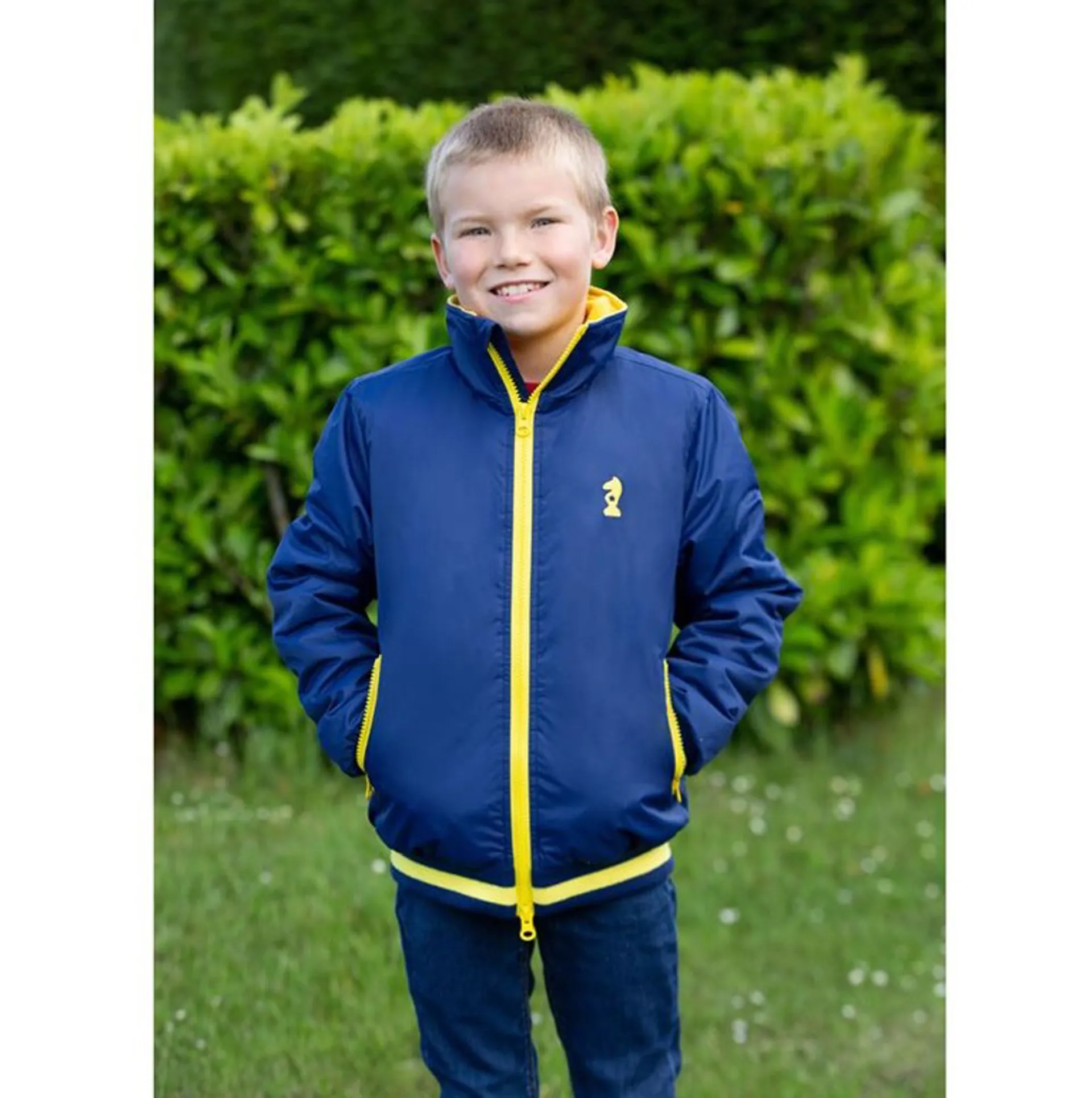 Featuring practical yellow zipped pockets including an inside pocket, yellow two-way zip with Little Knight emblem detail and elasticated varsity style yellow and navy hem and cuffs. Finished with the Little Knight logo on the back collar and the Little Knight emblem on the left chest.