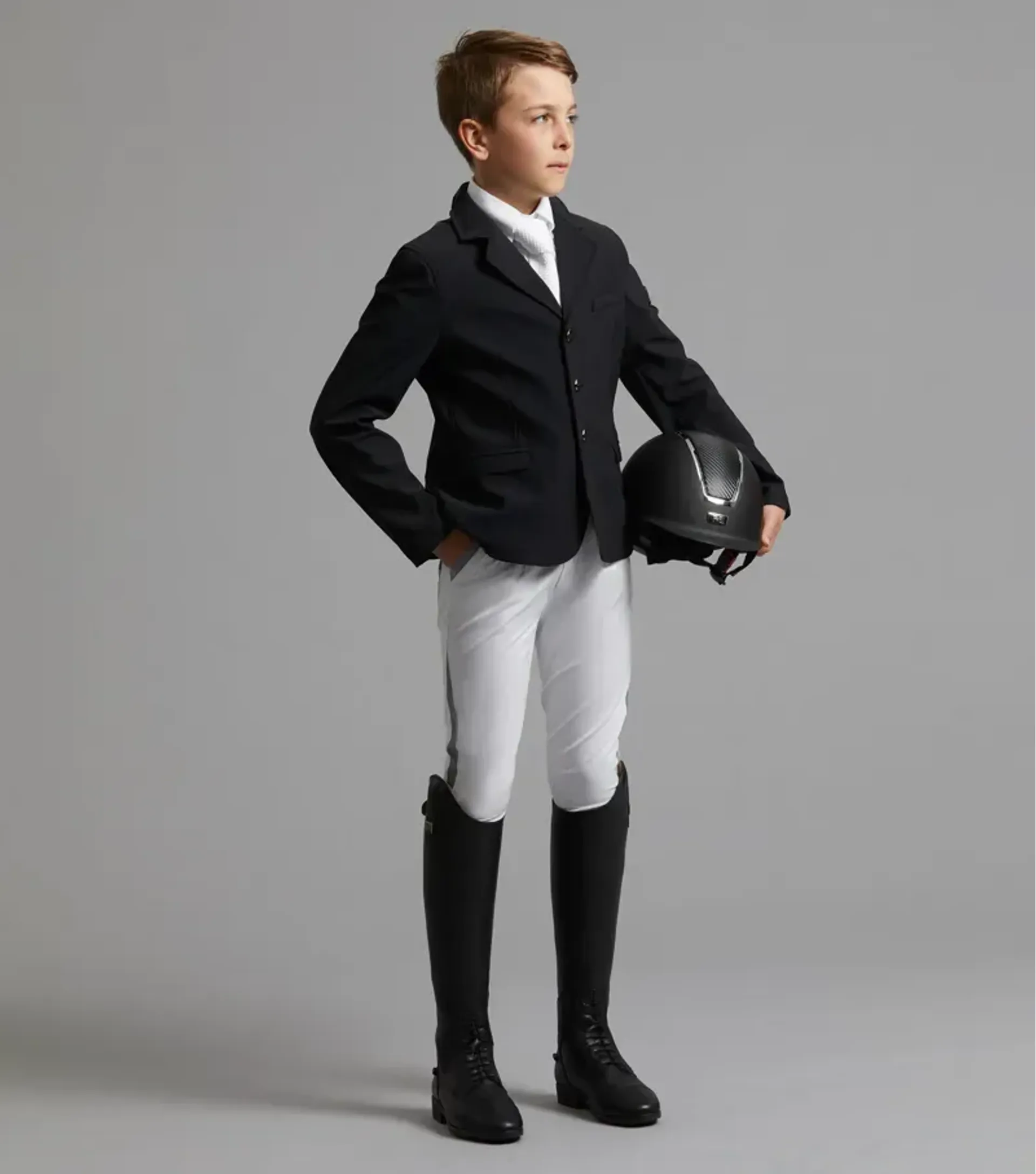 The classic boy's design delivers sophistication and comfort to the wearer through a range of technical properties and style details. Crafted from a highly breathable, lightweight, four-way stretch technical fabric, the Enzo competition jacket provides a refined and tailored fit delivering optimum comfort and long-lasting durability, making it a perfect staple piece in any riders collection.