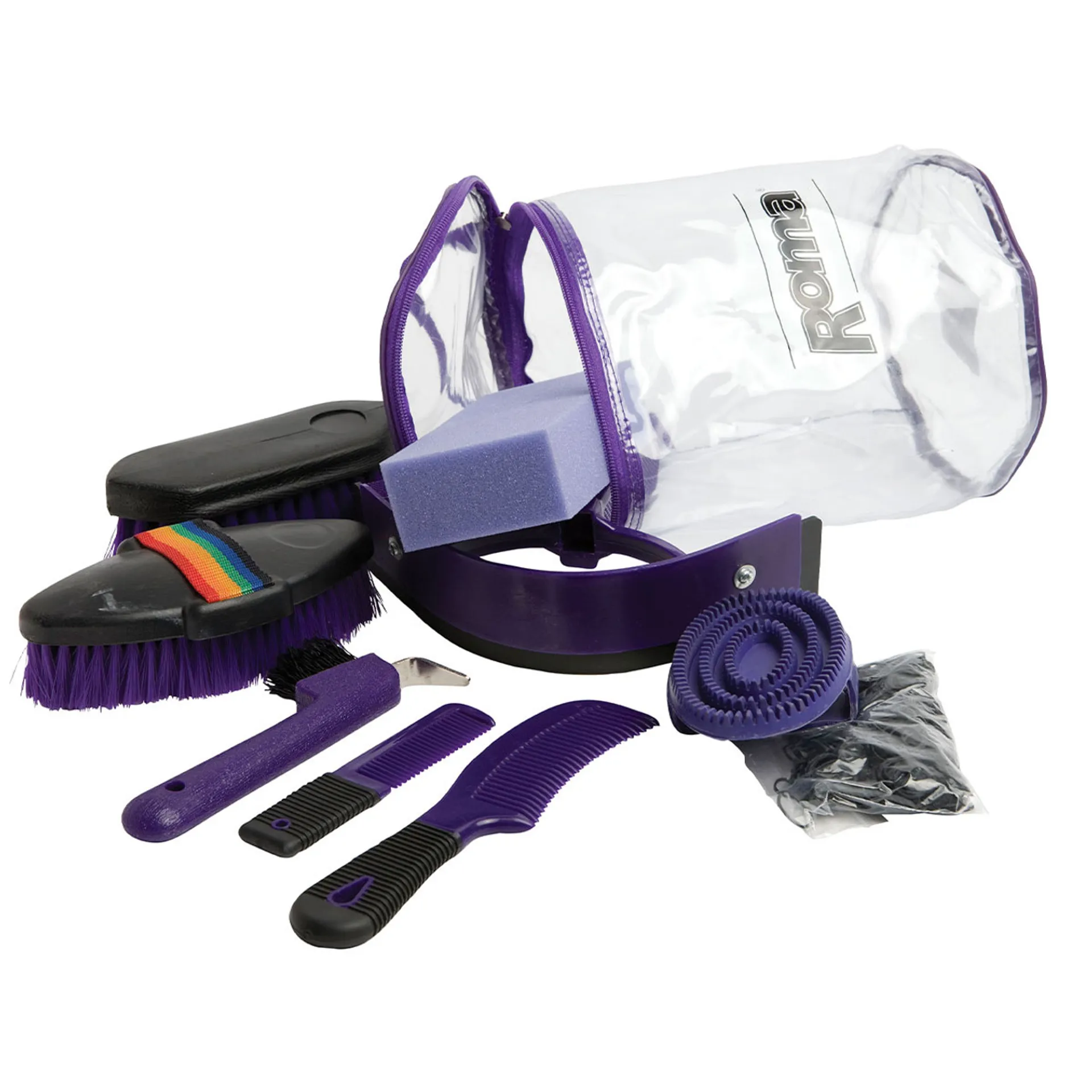 Kit includes a body brush, dandy brush, sweat scraper, curry comb, hoof pick with brush, mane & tail comb, rubber bands & sponge. All in a reusable bag to keep everything together and clean.