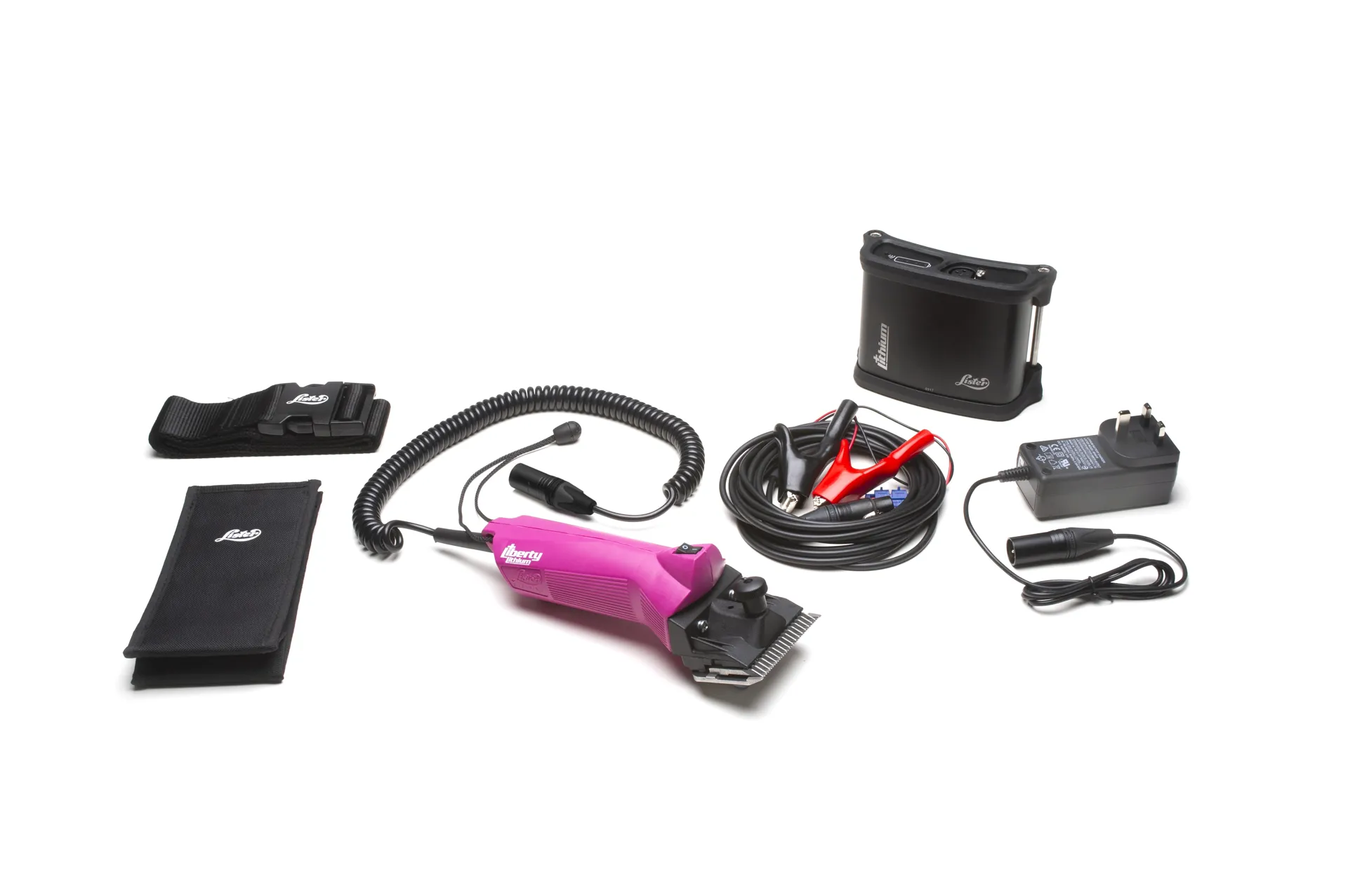 The Lister Liberty Lithium Field Pack contains: liberty clipper, battery pack, vehicle charger to use with a 12-volt battery and mains adaptor to allow the use of the clipper from the mains power supply.