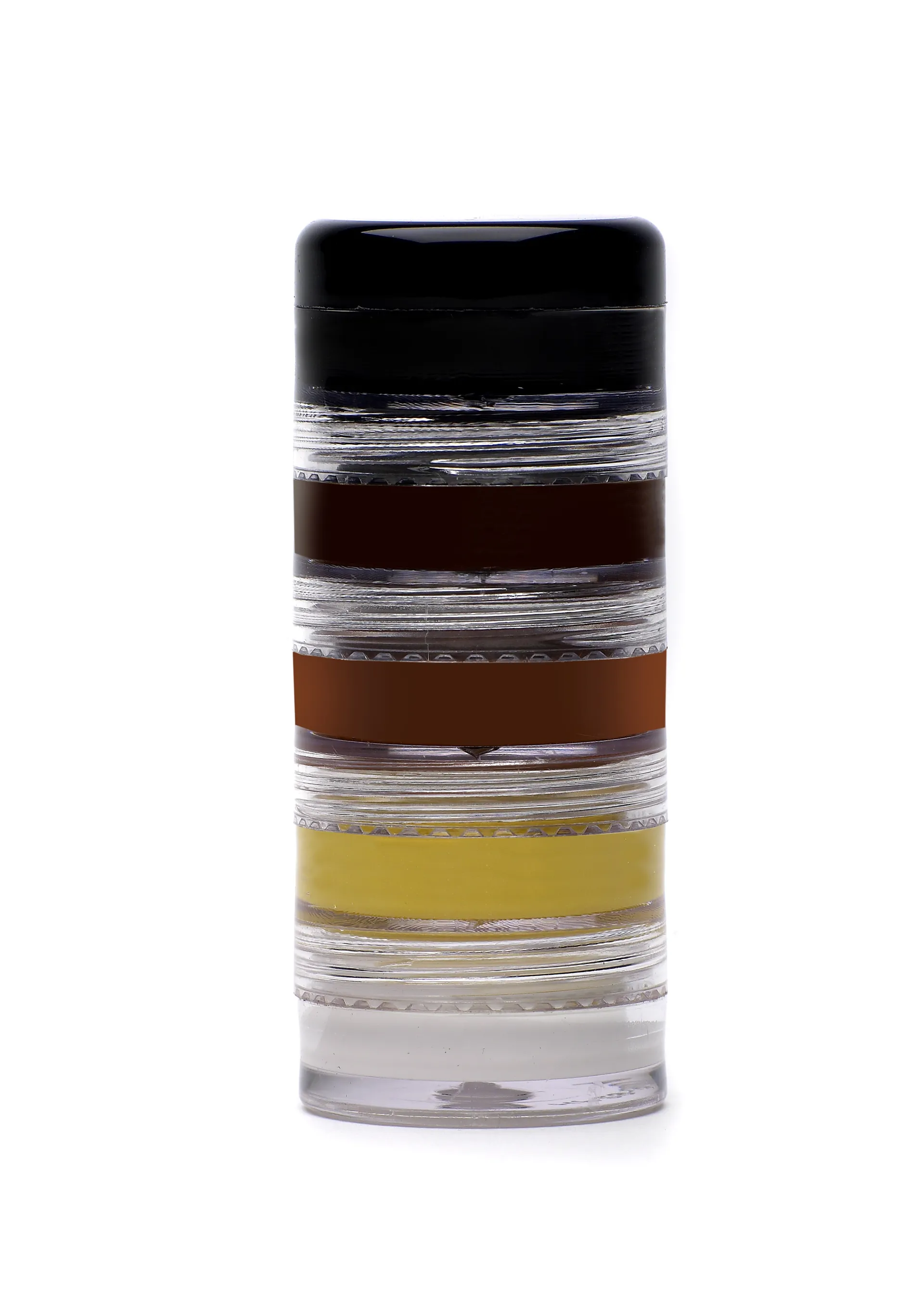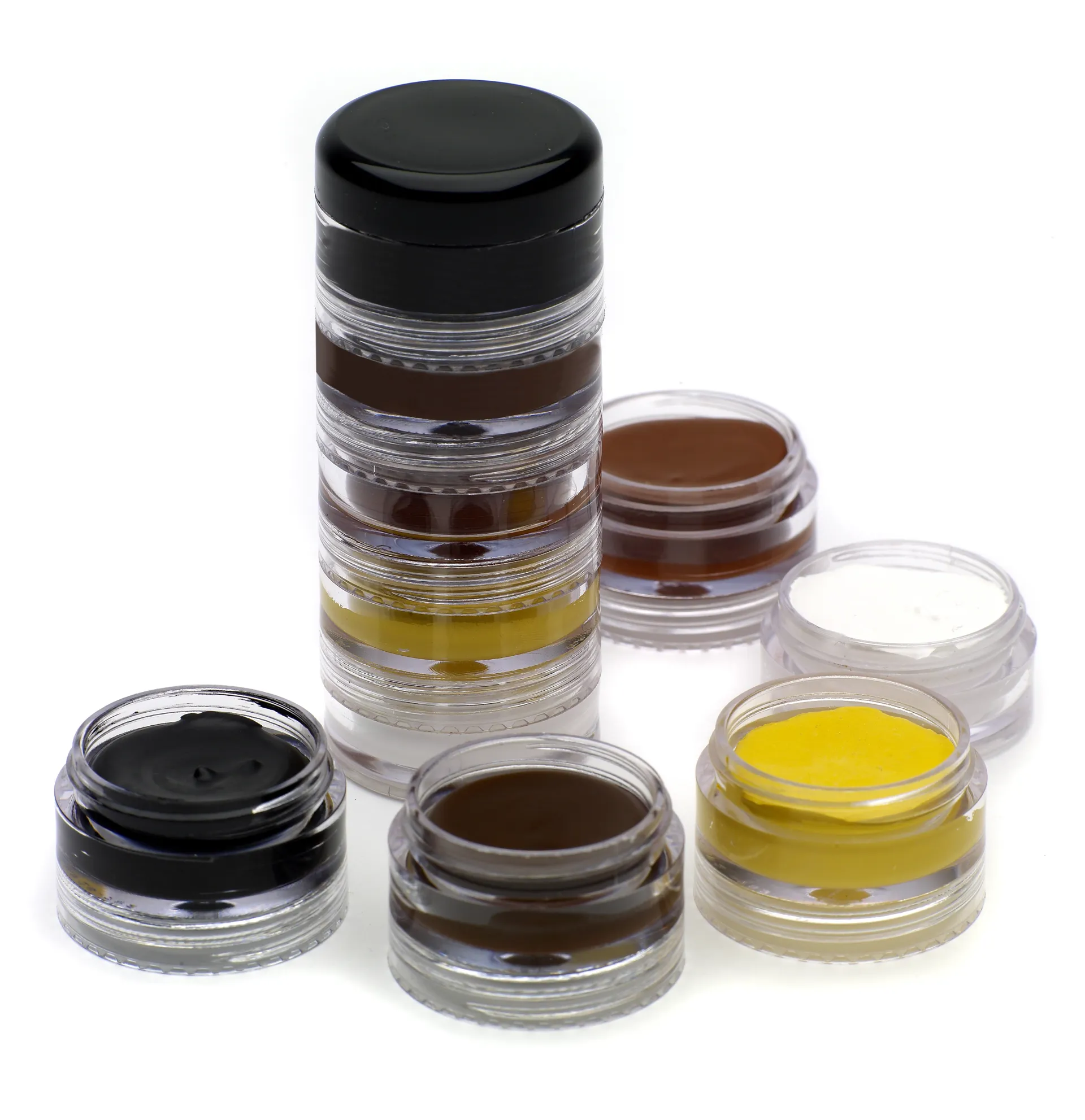 Stacking palette of 5 matt make up colours - black, dark brown, chestnut, palomino and white for blending and mixing when smaller quantities are required for covering marks, scars or stray coloured hairs.
