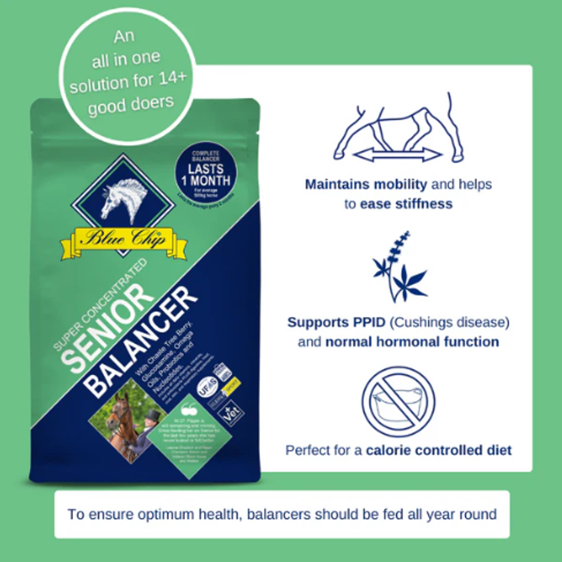 Blue Chip Senior Balancer is a complete, concentrated balancer specially formulated for elderly horses and ponies.