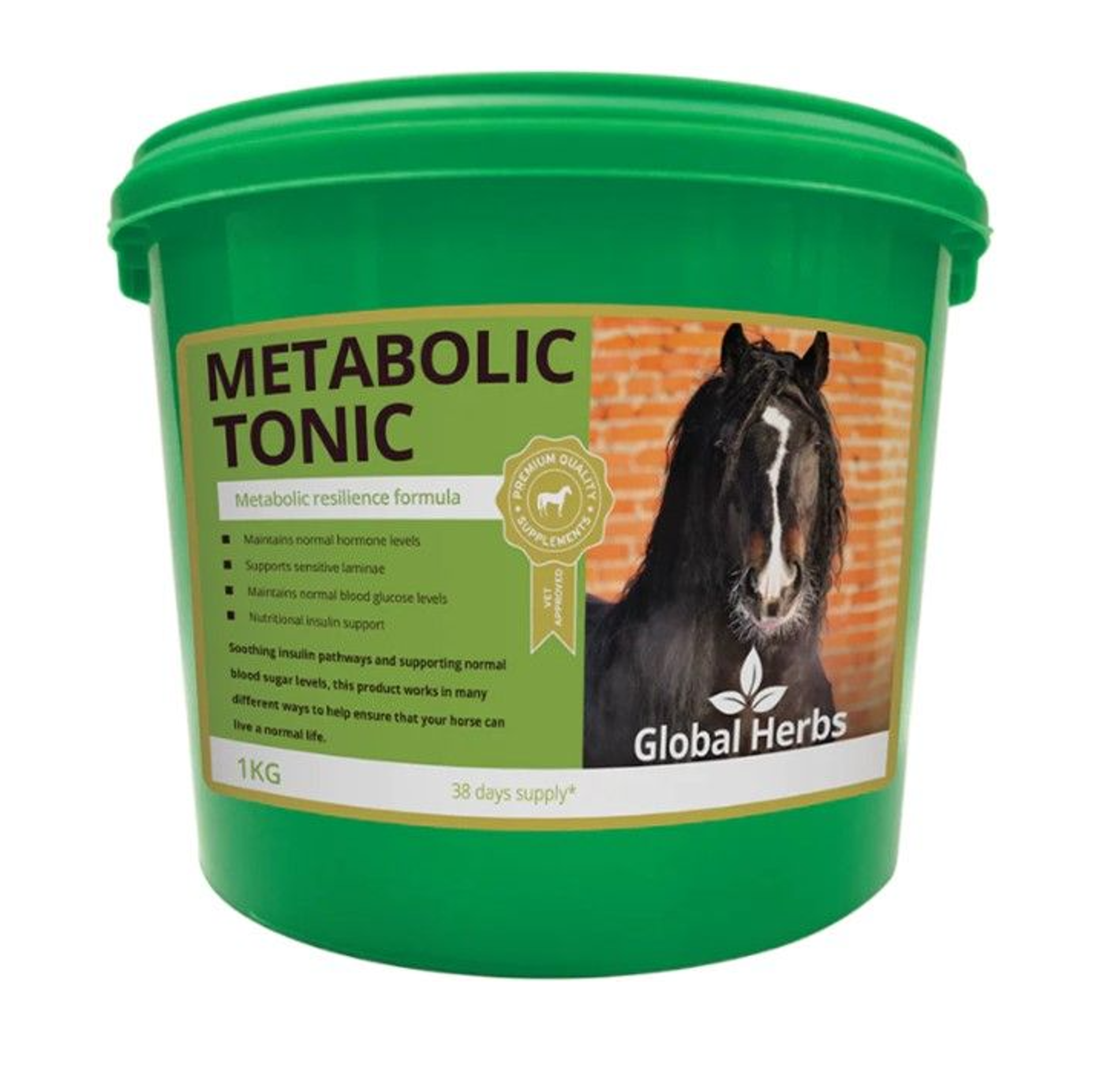 Global Herbs Metabolic Tonic supports your horse’s natural metabolism, helping maintain energy, blood glucose balance, and overall metabolic harmony. It can aid in managing insulin sensitivity, fat distribution, laminae health, and normal drinking and urination, supporting fitness, vitality, and wellbeing.