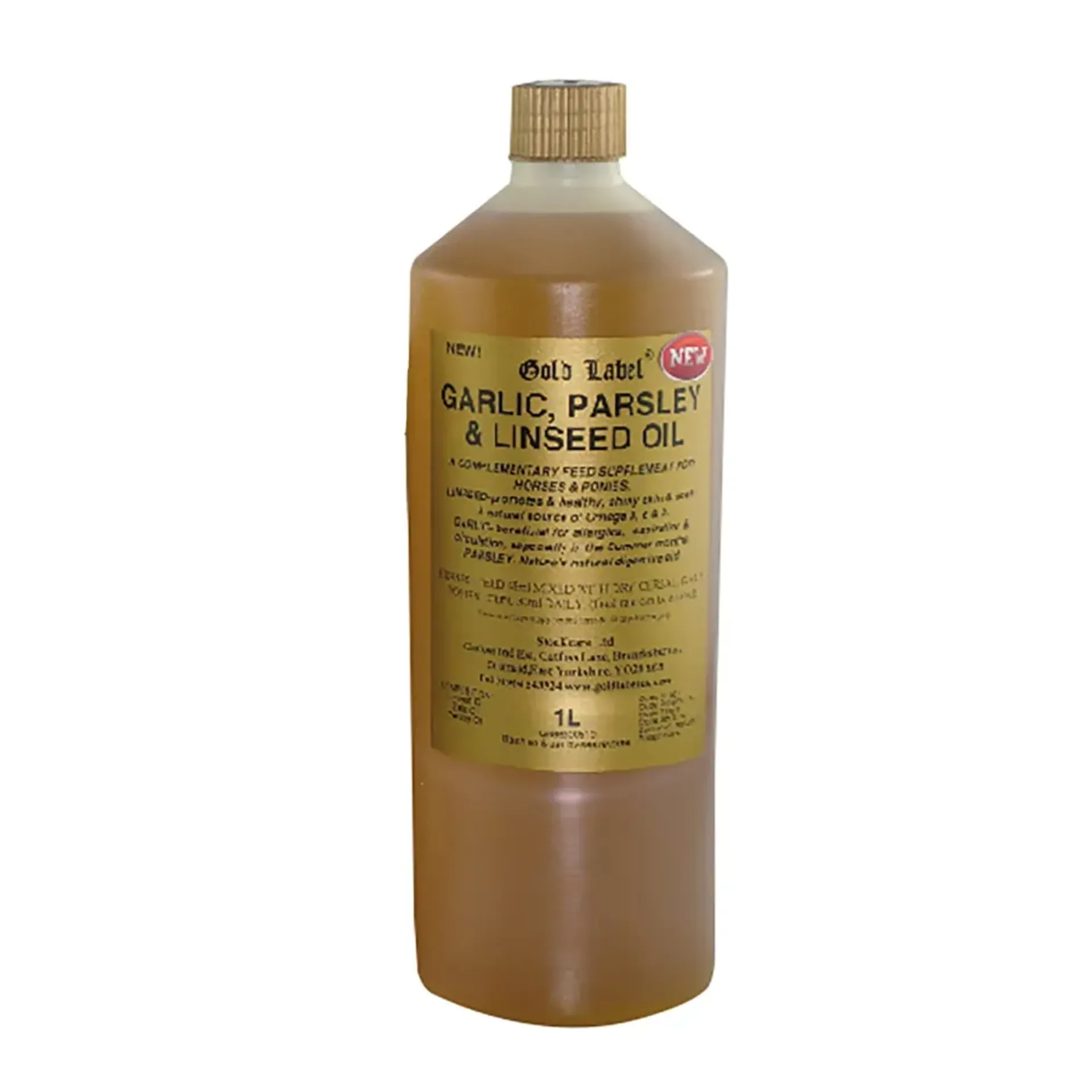 Gold Label Garlic, Parsley and Linseed Oil is a daily feed supplement for horses. It has been formulated for daily use to promote healthy skin, respiration and digestion, particularly in the summer months.
