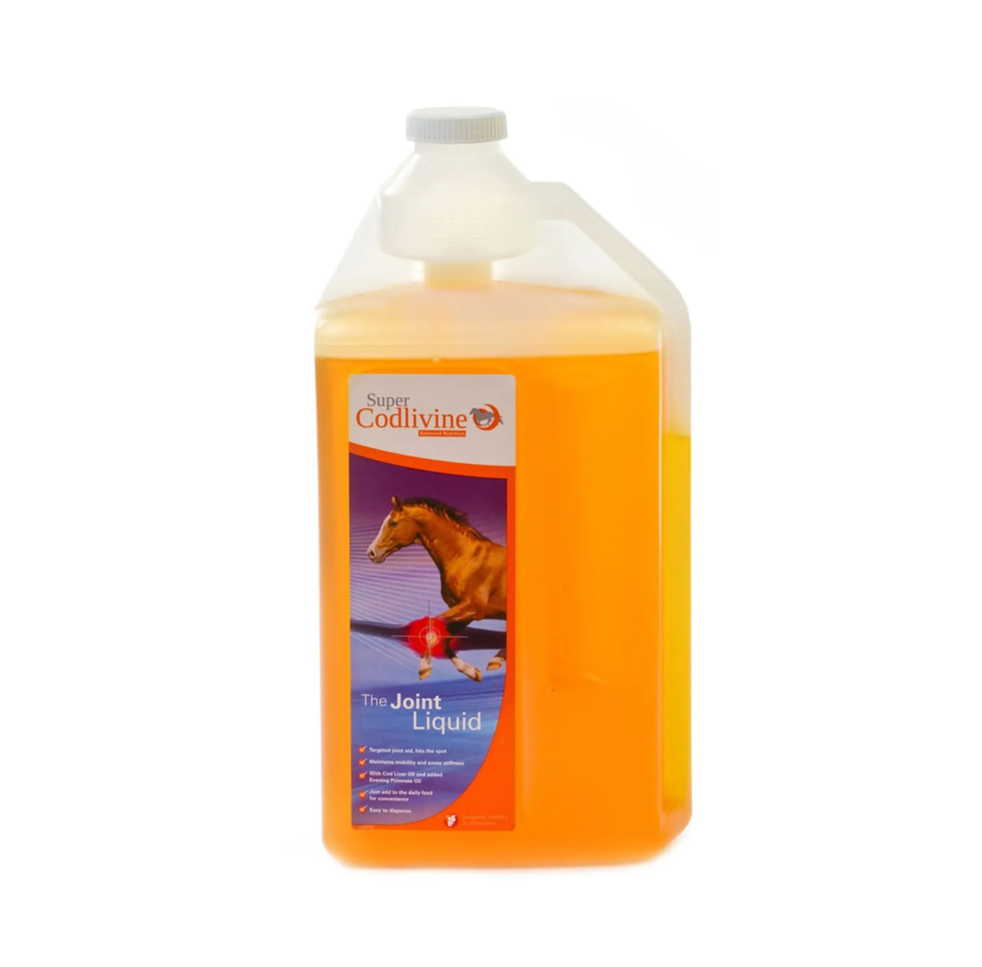 Support your horse’s joint health and mobility with Super Codlivine Joint Liquid, a premium supplement blending Cod Liver Oil and Evening Primrose Oil to provide essential polyunsaturated fatty acids.
