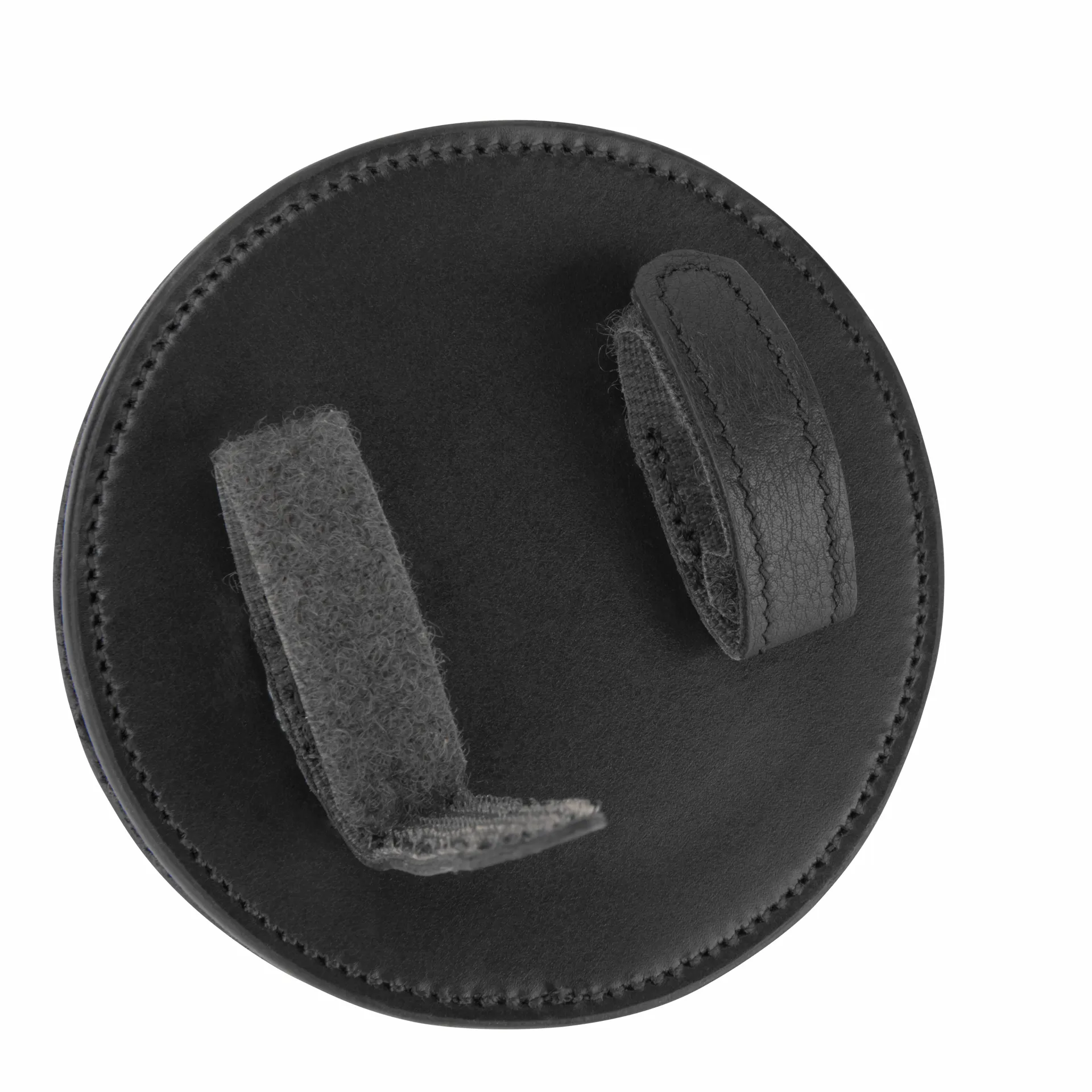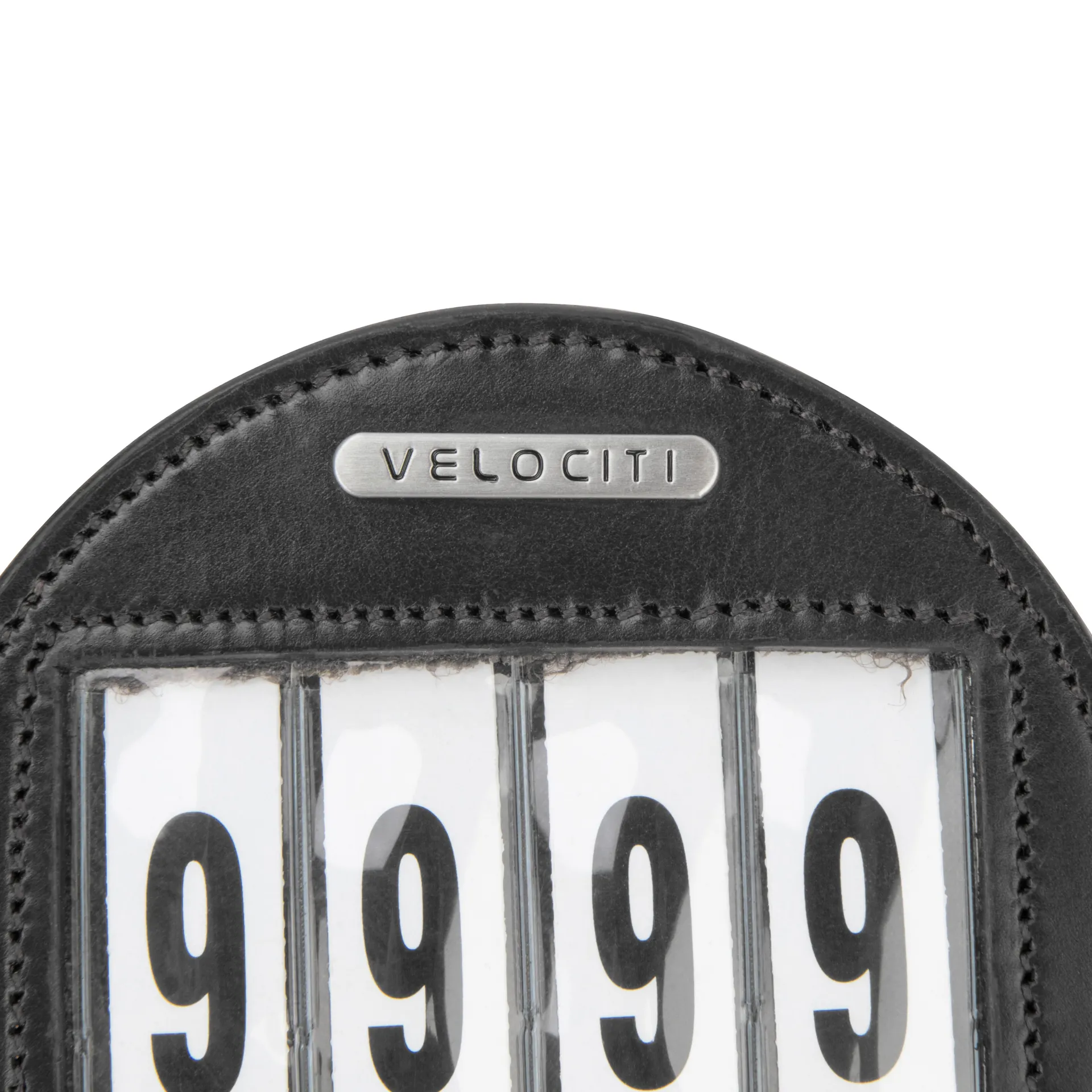 A pair of touch-close loops secure to the bridle. The leather unit is supplied with a wipe clean 3-slot sleeve and 3 sets of numbers 0-9.
