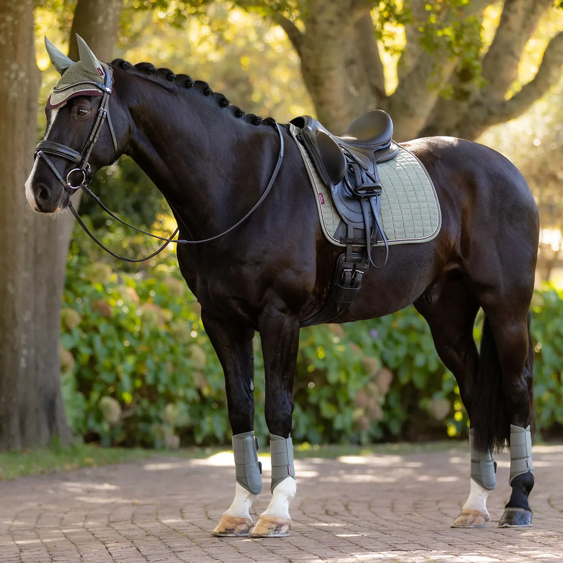 A durable girth protection area enhances longevity, while the girth keepers with inner looped channels provide multiple girthing options. For a coordinated look, the Suede Dressage Square can be paired with a matching LeMieux Classic Fly Hood.