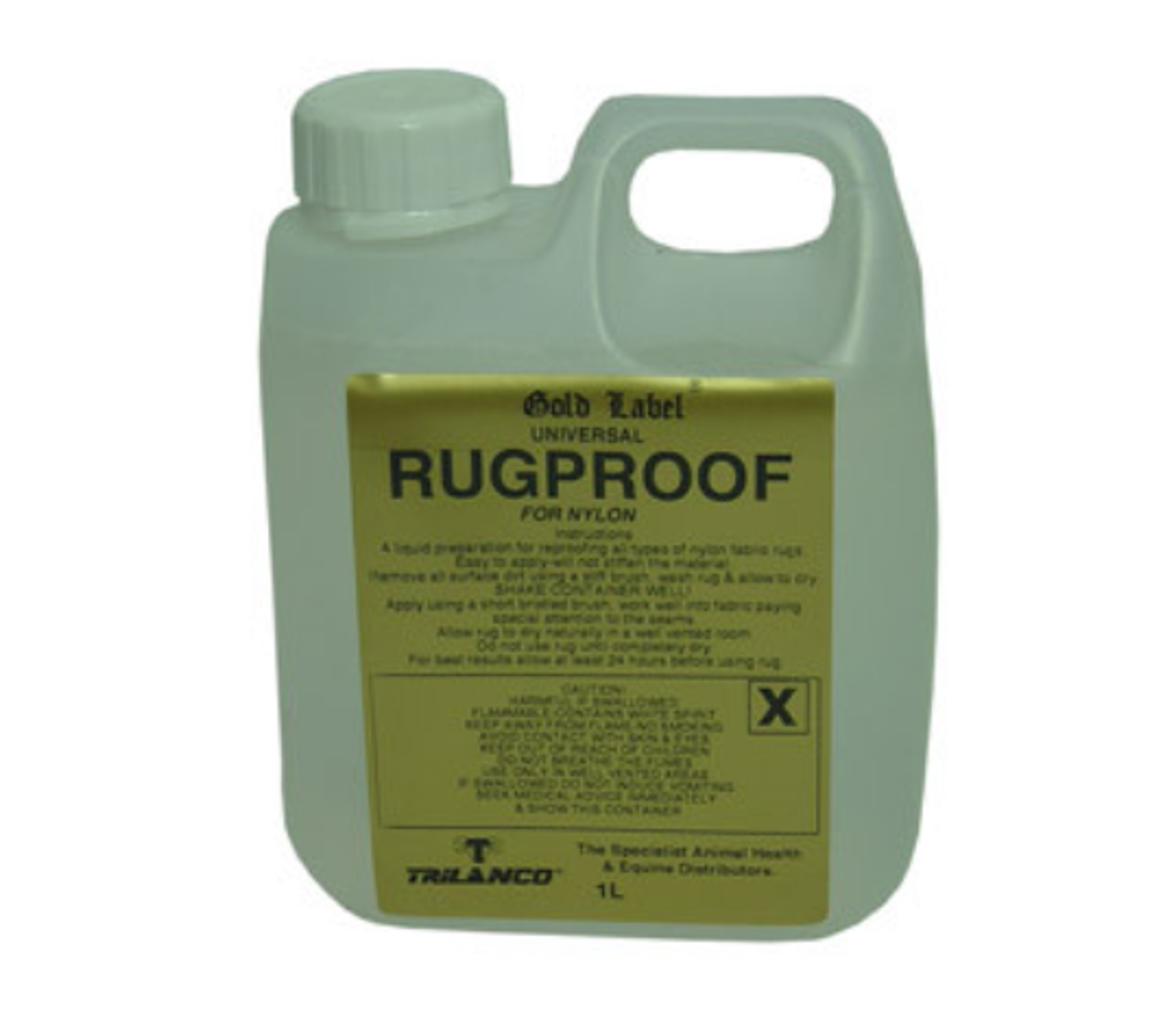 Gold Label's Waterproofing Liquid for Nylon is a specially formulated liquid designed to restore water-resistance to all types of nylon fabric rugs. Easy to apply with a short-bristled brush, it penetrates the fabric while maintaining flexibility, leaving rugs weatherproof without stiffening.