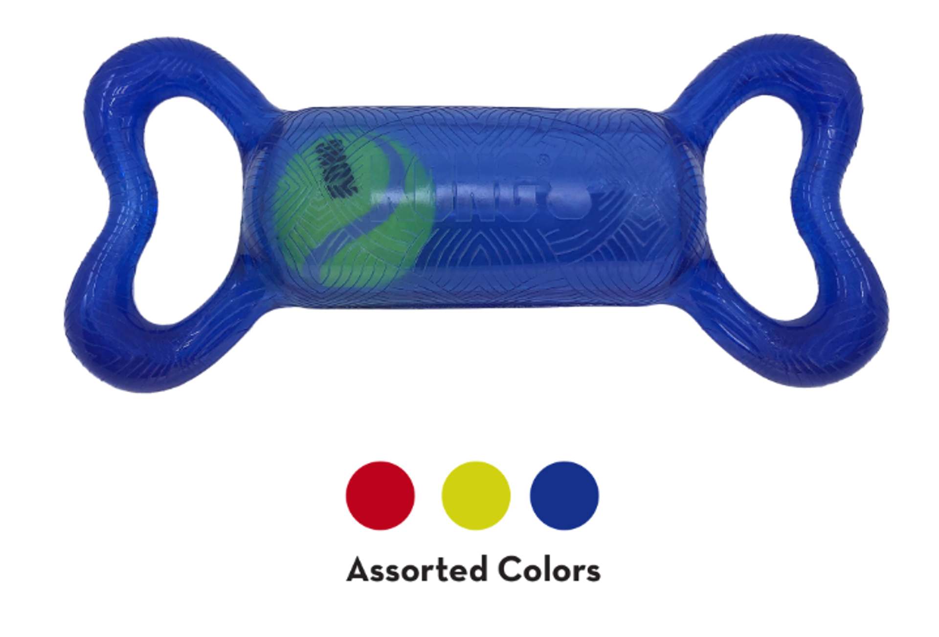 KONG Jumbler Tug Bone’s rolling interior tennis ball and loud squeak spark tug-and-fetch fun.