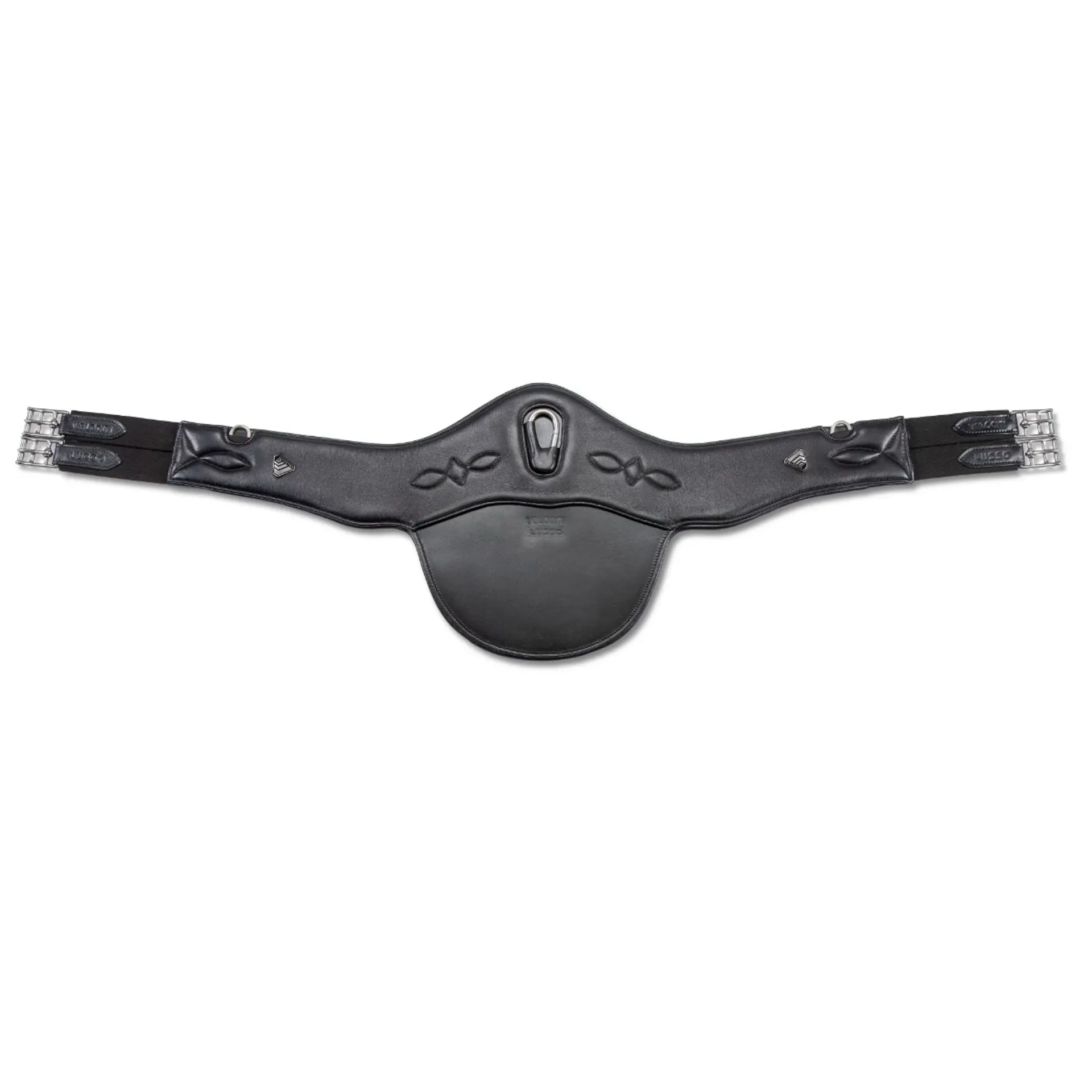 Smooth, continuous girth edges are padded and curved away from the horse to prevent a ‘cut in’ edge. A strong and hardwearing outer leather flexes but resists stretching for longevity. Evenly spaced D-rings and central carabiner for easy attachment of training aids or breastplates.