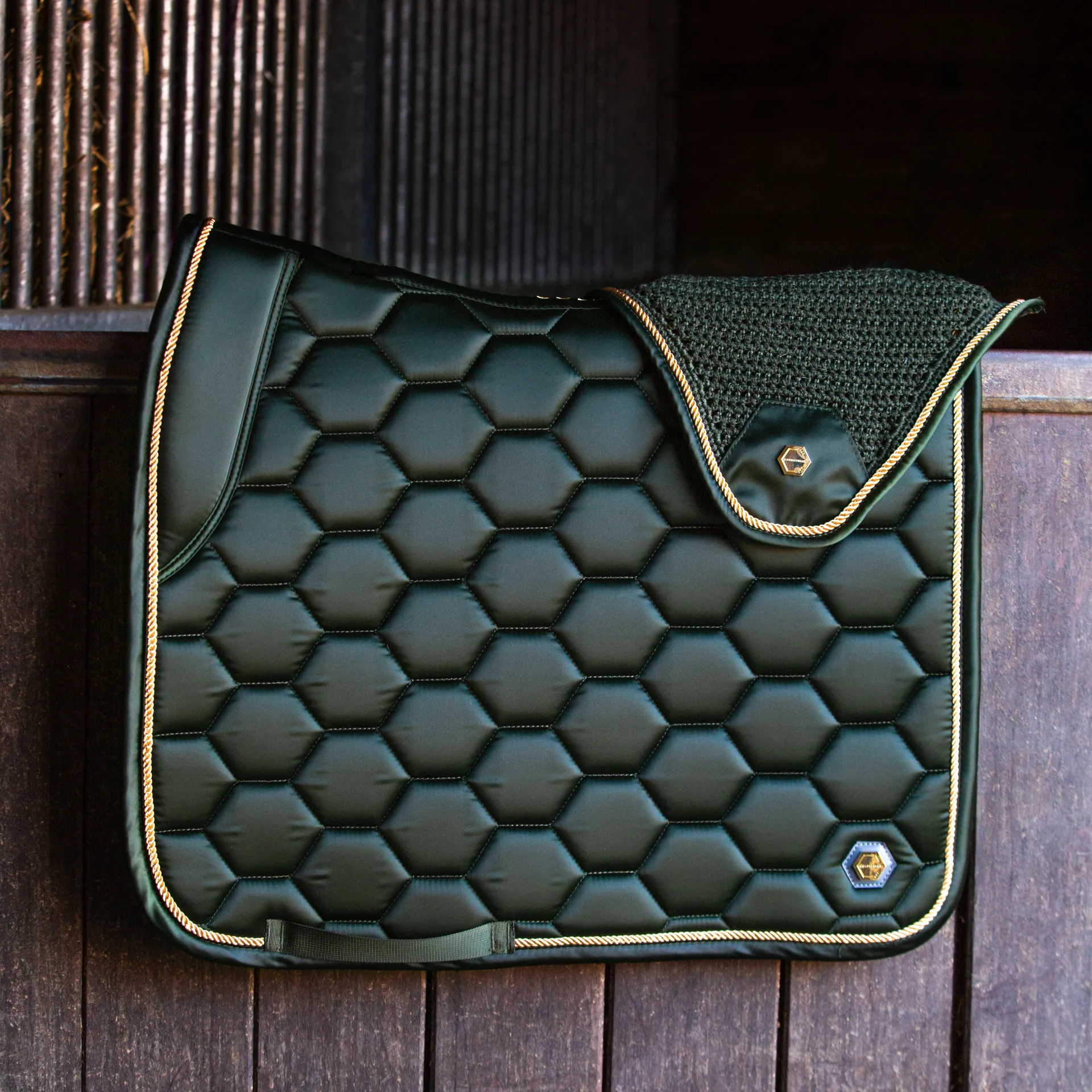 The Coldstream luxury Marygold Saddle Pads are meticulously crafted from a deluxe silk material with hexagonal logo quilting for a classy and sophisticated style.