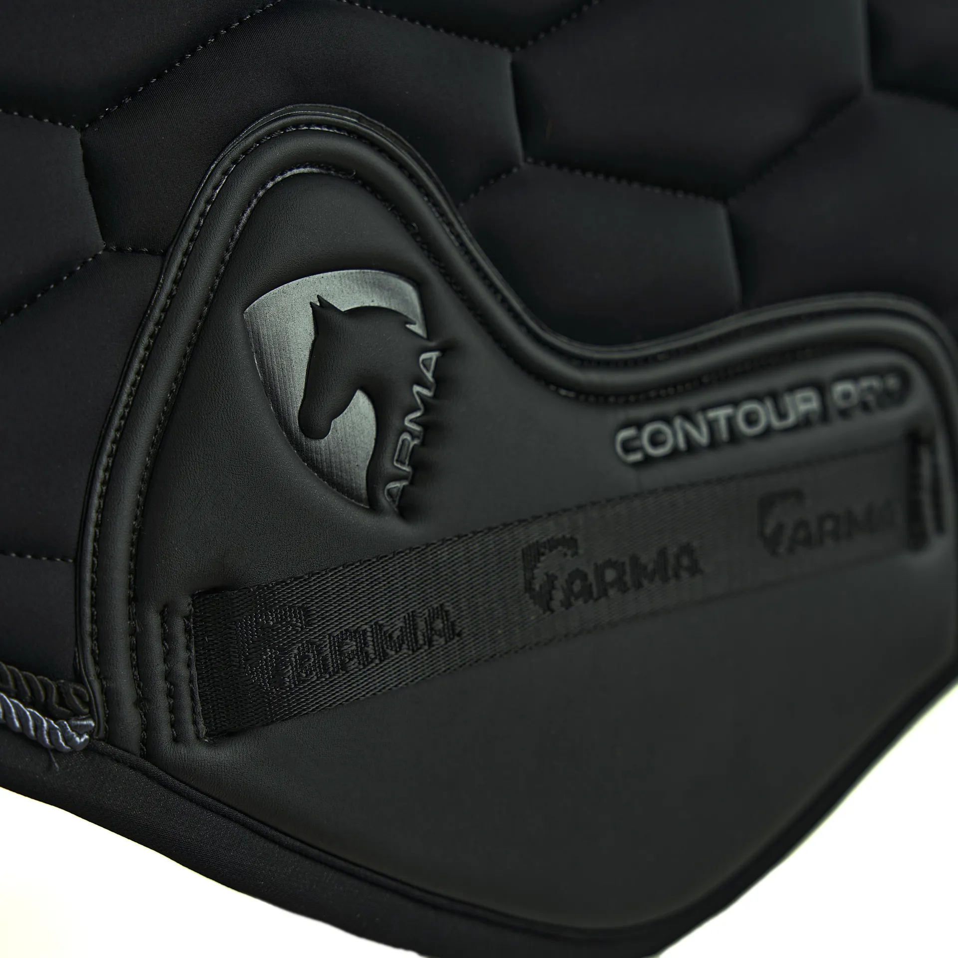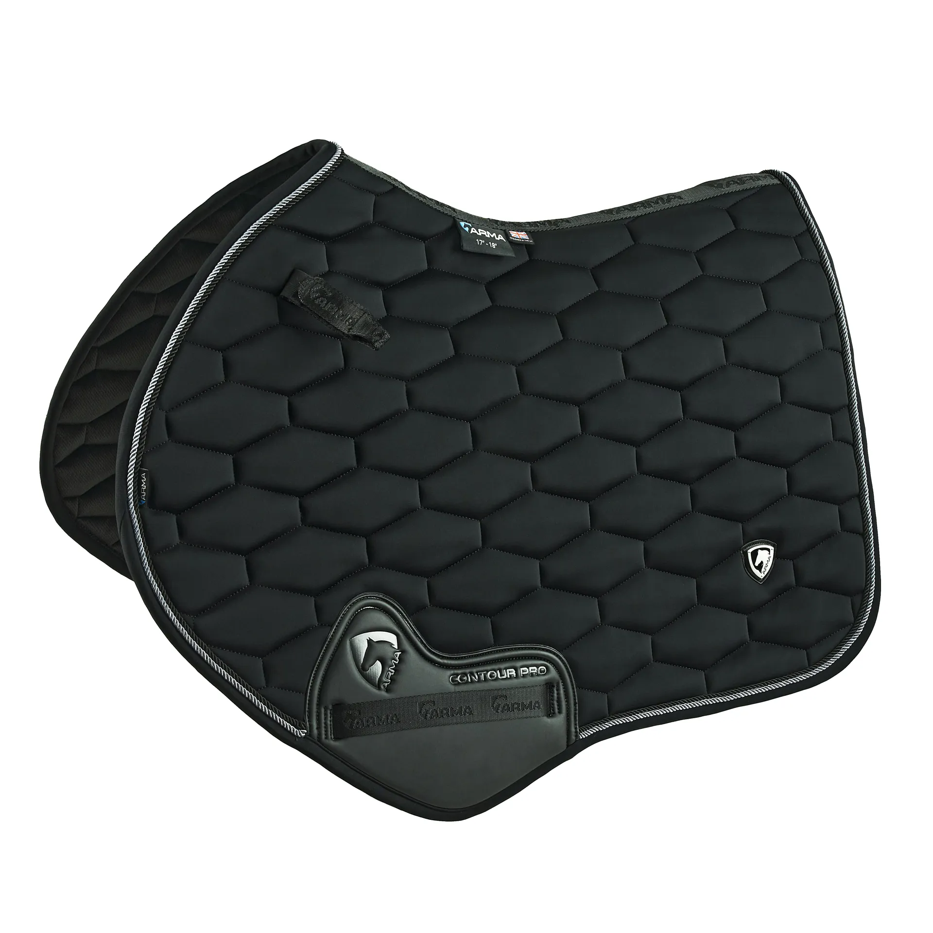 The PU ARMA contour pro girth guard protects heavy wear areas, jacquard logo tape looks smart at the spine, girth loops and elasticated D-ring straps. A smart metal ARMA badge finishes the look.