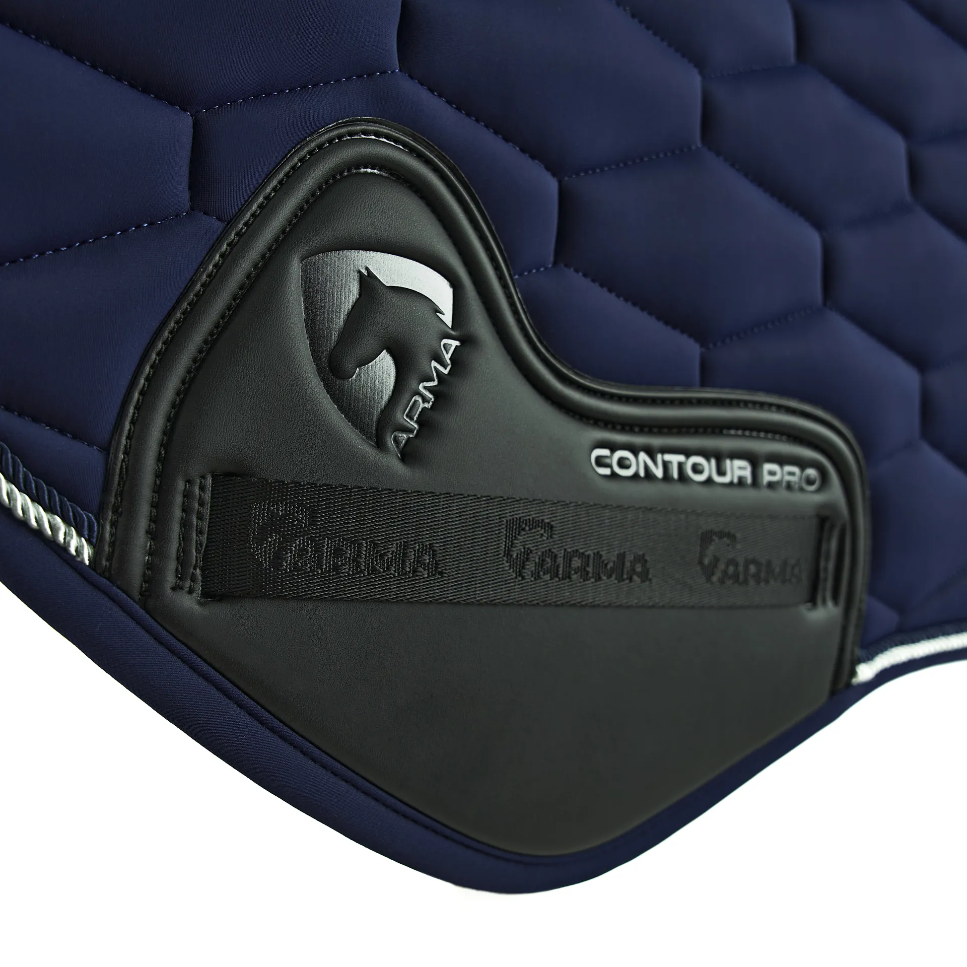 The PU ARMA contour pro girth guard protects heavy wear areas, jacquard logo tape looks smart at the spine, girth loops and elasticated D-ring straps. A smart metal ARMA badge finishes the look.