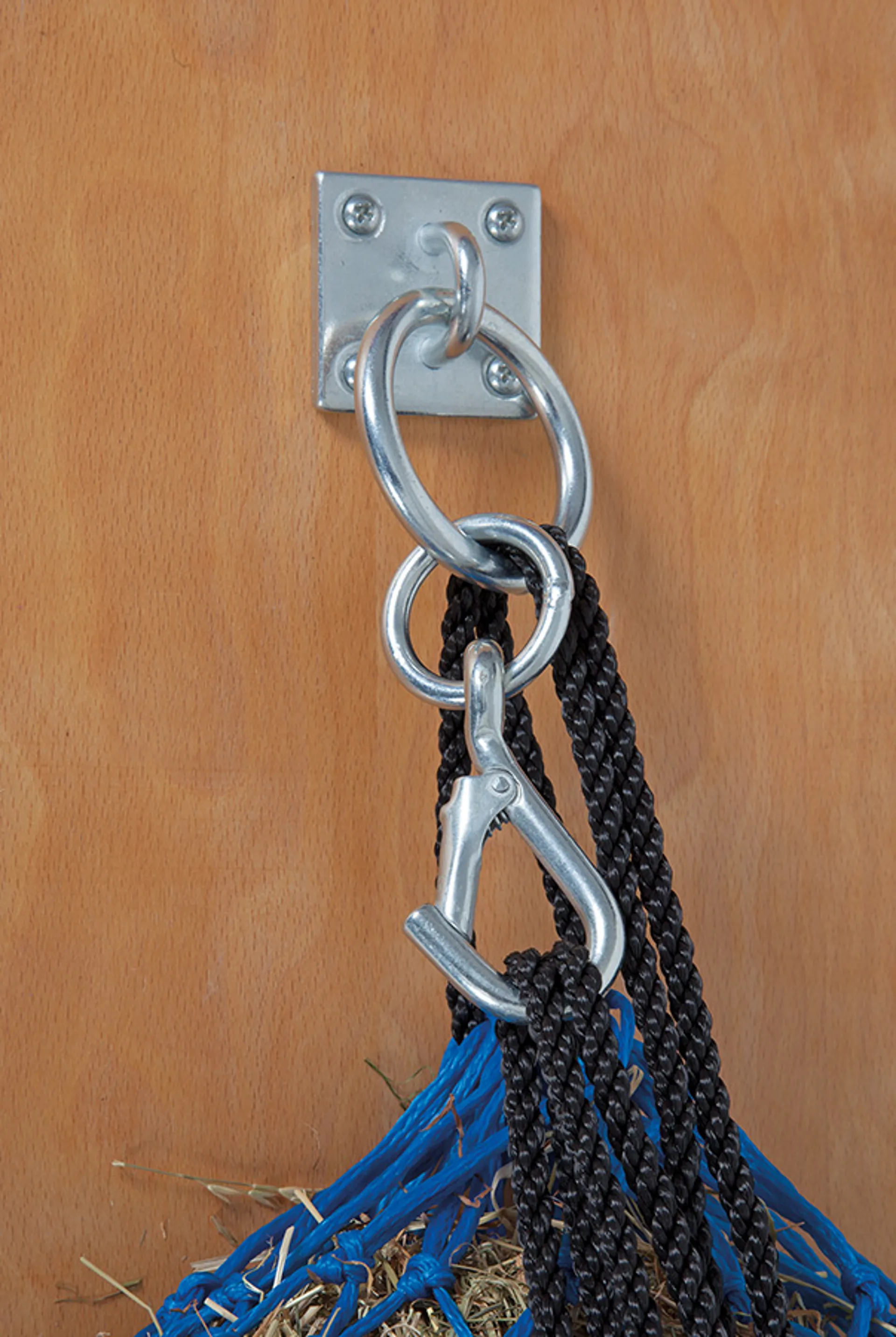 This labour saving device avoids the need for tying up haynets with knots that can come undone or tangle.
